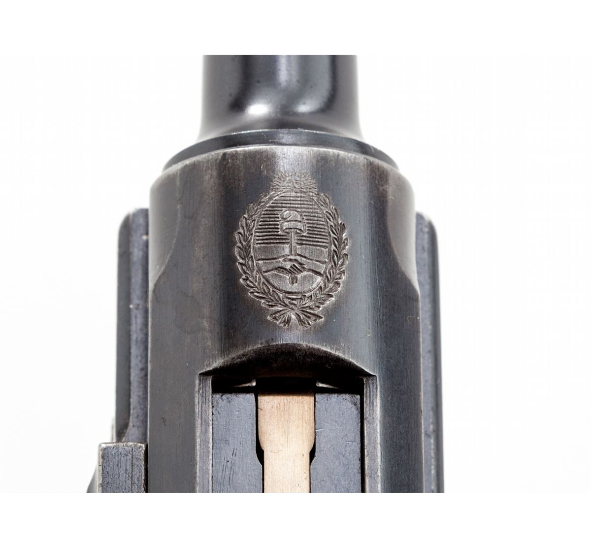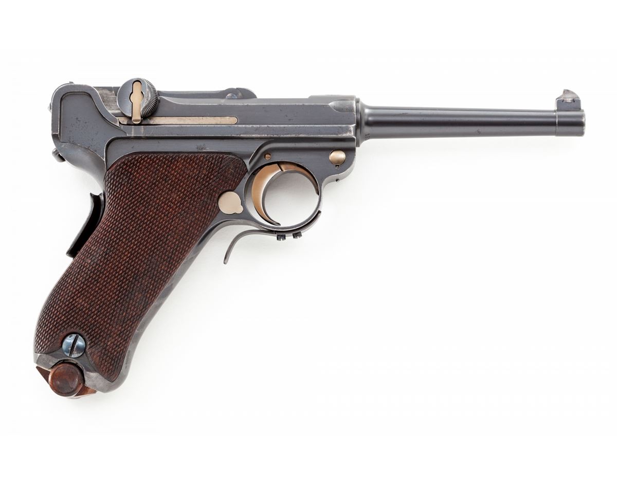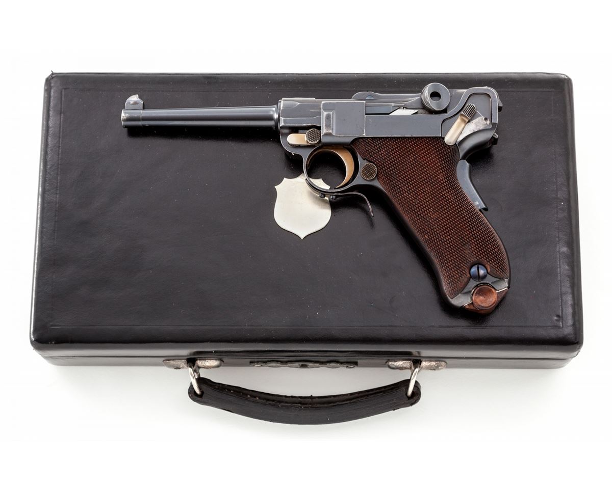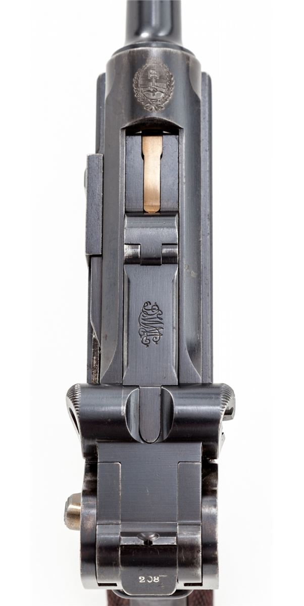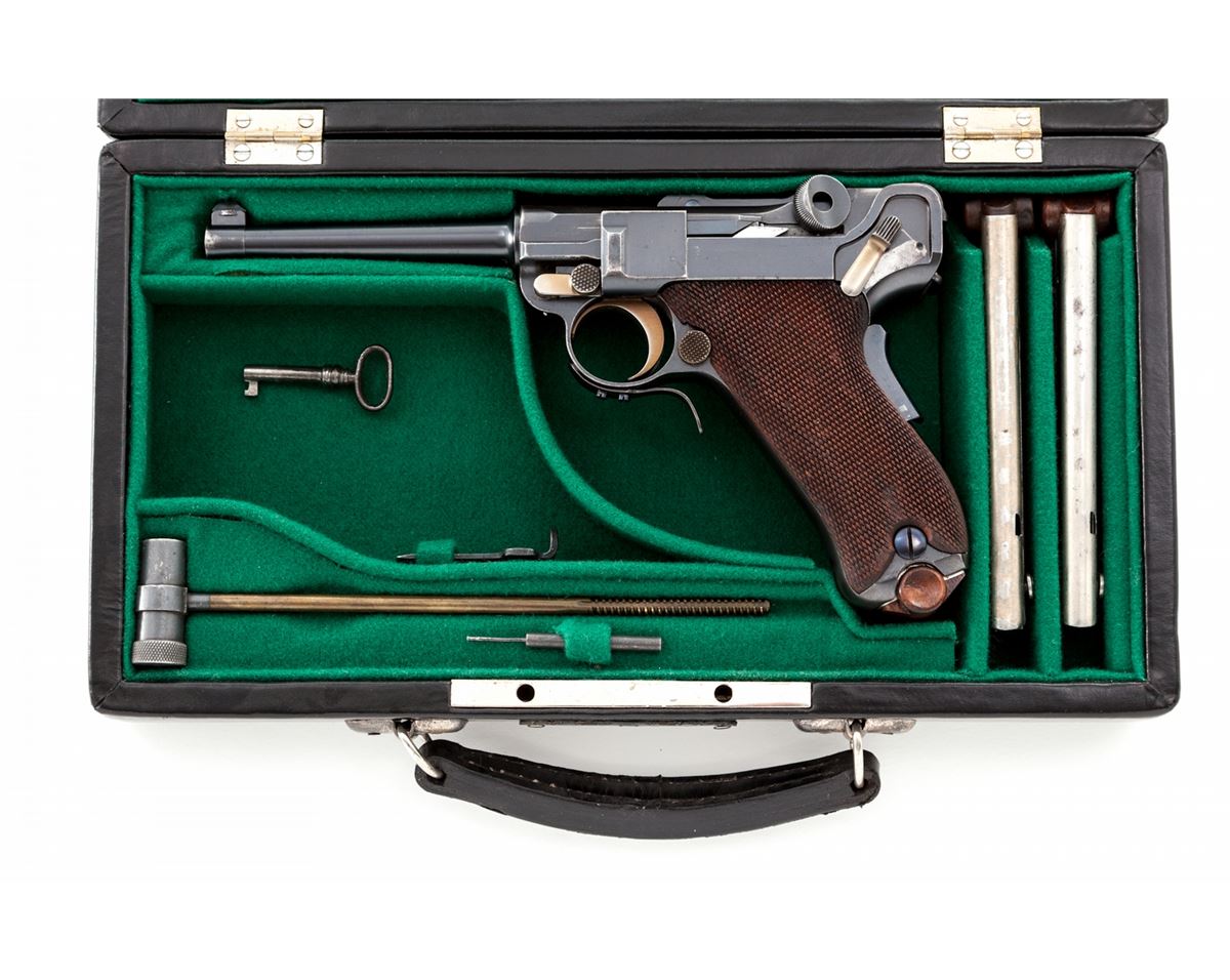 Rare Argentine Crest 1900 Target Test Luger, #16208, .30 Luger cal., 4-3/4'' barrel, blue finish with straw small parts, factory checkered walnut grips, in modern case, with three unmarked nickel-plated wood based magazines, one combination tool, pin punch and combination cleaning rod/oiler. Argentine national crest rolled through the finish to top of chamber, DWM marked toggle, lower portion of thumb safety polished bright, scalloped toggle knobs, grip safety, and smooth lugless backstrap; additional spring steel finger rest affixed to lower portion of triggerguard. Pistol is devoid of all proof or acceptance markings, with full serial number to front of frame, bottom of barrel, and last three digits to bottom of sideplate and rear toggle link; all other visible parts with last two digits. Considered extremely rare with estimates running at less than 100 for all combined variants. This particular pistol may be unique. Condition is fine to near excellent retaining approx. 92%-94% blue with very light thinning to straw parts. Grips with light bruises. Action is crisp, bore is fair. Contemporary case is excellent; accessories are fine. Est.: $7,500-$10,000. (C&R/PPT) (John Siroonian estate)