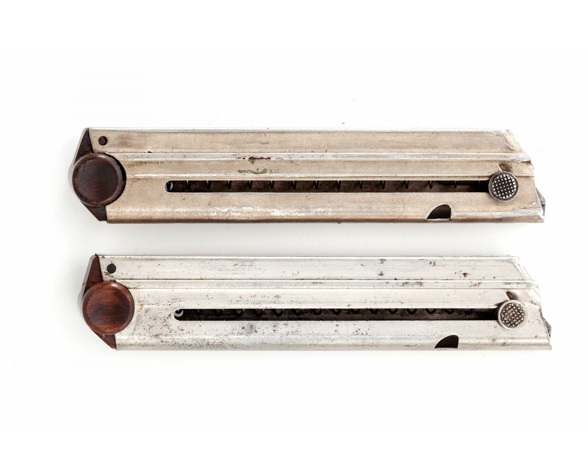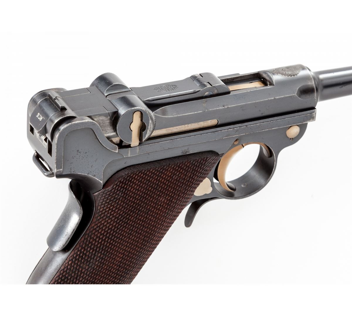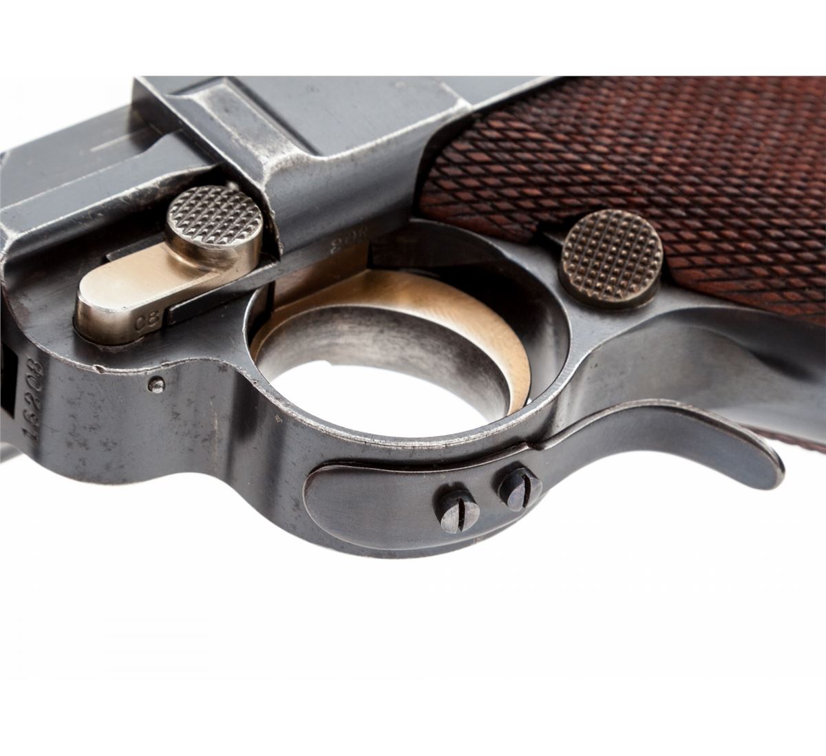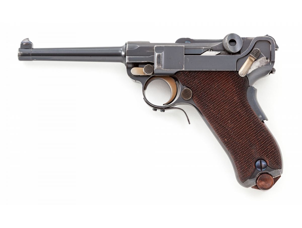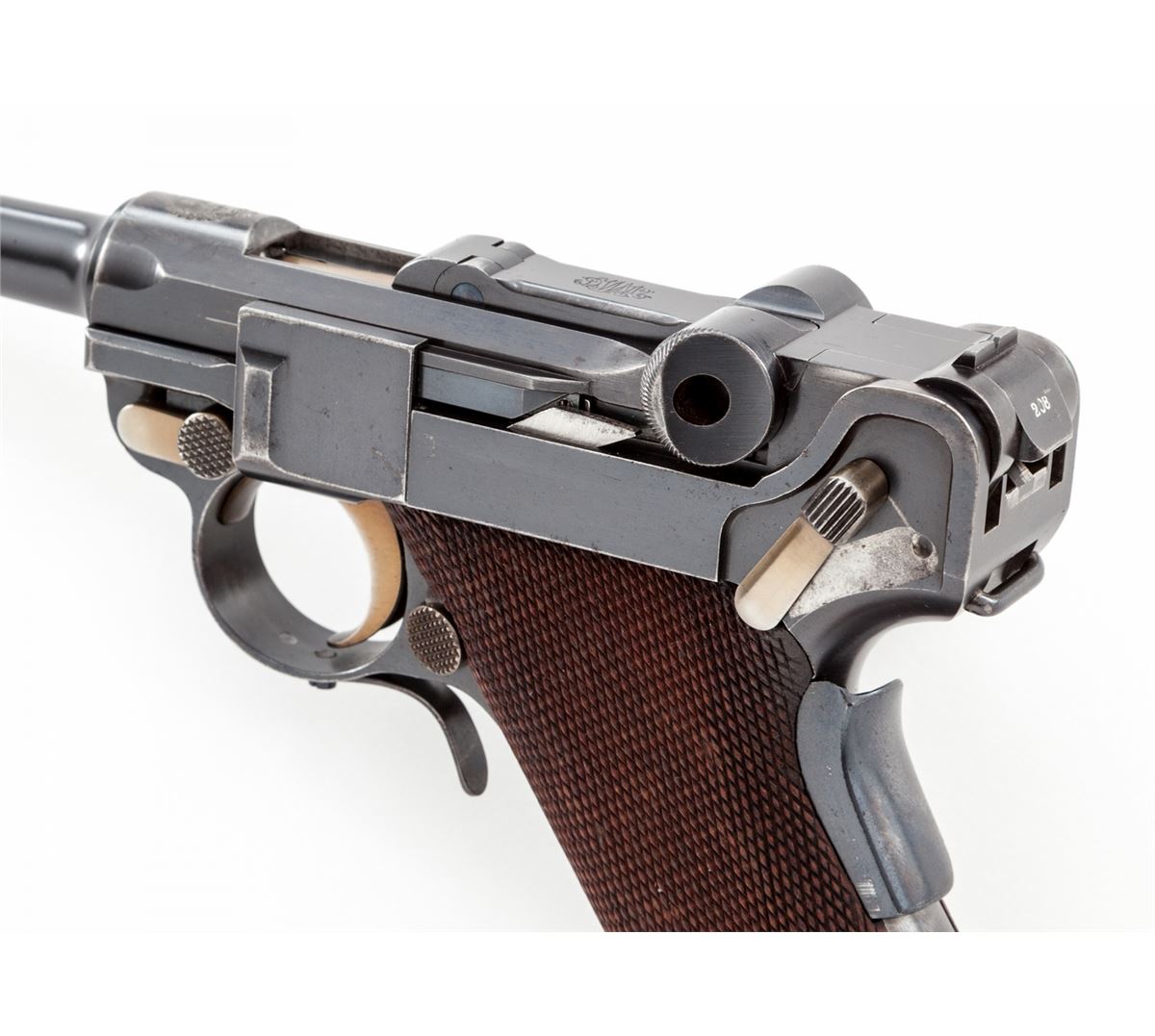 Rare Argentine Crest 1900 Target Test Luger, #16208, .30 Luger cal., 4-3/4'' barrel, blue finish with straw small parts, factory checkered walnut grips, in modern case, with three unmarked nickel-plated wood based magazines, one combination tool, pin punch and combination cleaning rod/oiler. Argentine national crest rolled through the finish to top of chamber, DWM marked toggle, lower portion of thumb safety polished bright, scalloped toggle knobs, grip safety, and smooth lugless backstrap; additional spring steel finger rest affixed to lower portion of triggerguard. Pistol is devoid of all proof or acceptance markings, with full serial number to front of frame, bottom of barrel, and last three digits to bottom of sideplate and rear toggle link; all other visible parts with last two digits. Considered extremely rare with estimates running at less than 100 for all combined variants. This particular pistol may be unique. Condition is fine to near excellent retaining approx. 92%-94% blue with very light thinning to straw parts. Grips with light bruises. Action is crisp, bore is fair. Contemporary case is excellent; accessories are fine. Est.: $7,500-$10,000. (C&R/PPT) (John Siroonian estate)