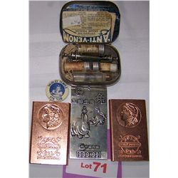ALSO INCLUDES (2) I/2 LB. COPPER STAMPED BARS & CHINES SILVER BAR MARKED .999