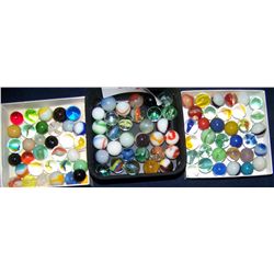 LOT OF 100 VINTAGE ASSORTED MARBLES, INCLUDING CLEARIES, CAT'S EYES, SHOOTERS & MORE. AS SHOWN