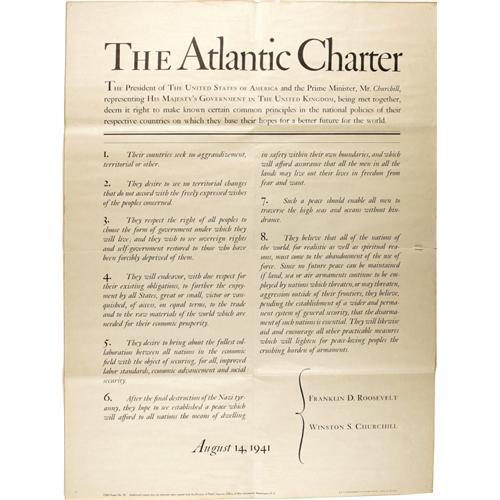<B>Rare Atlantic Charter Broadside by U.S. Government Printing Office.</B></I> One page, 28.5" x 40", Washington D.C., August 14, 1941. Very few of these broadsides have survived. The charter reads in part: "The Atlantic Charter The President of the United States of America and the Prime Minister, Mr. Churchill, representing His Majesty's Government in the United Kingdom, being met together, deem it right to make known certain common principles in the national policies of their respective countries on which they base their hopes for a better future for the world." Fine condition.<BR><BR><b>Shipping:</b> Small Flat (<a target="_blank" href="http://www.heritageauctions.com/common/shipping.php">view shipping information</a>)