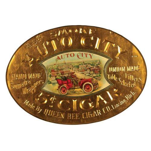 Rare Auto City Cigars, reverse glass, chain hanging sign. Made by Queen Bee Cigar Co., Lansing, MI. From the Bob Lyons Collection. Excellent condition. 13 1/2 X 9 1/2 inches.