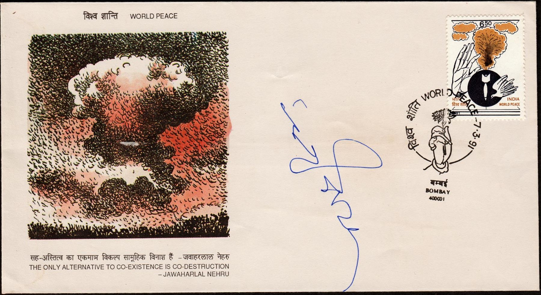 Autographed First Day Cover, 1991, autographed by the former Prime Minister “Sri Chandrashekhar”, stamp of value Rs 6.50 “India World Peace” tied and cancelled with a round pictorial seal outlined as “विश्व शान्ति WORLD PEACE – 7.3.91 | picture of a hand holding a lotus flower | बम्बई | BOMBAY | 400001”. There is a beautiful pictorial representation of World Peace, विश्व शान्ति, on the front with a slogan quoted by Pandit Jawaharlal Nehru as “THE ONLY ALTERNATIVE TO CO-EXISTENCE IS CO-DESTRUCTION” also printed in Devanagari (Hindi) as “सह-अस्तित्व का एकमात्र विकल्प सामूहिक़ विनाश है”, good condition, Rare.