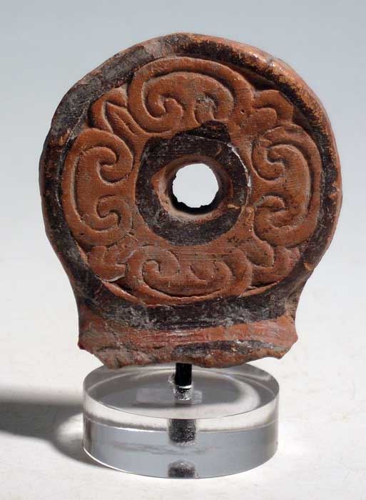 A rare Aztec incensario fragment from Mexico, c. AD 1400 - 1500, this rare adorno represents a ball court ring with intricate floral design referring to Xochipilli, the Aztec god of flowers, music and dance as well as the patron of the ballgame. The design is neatly incised and highlighted with black pigment. H: 2 1/2 in. Good mineral deposits. Mounted. Ex Chicago estate.