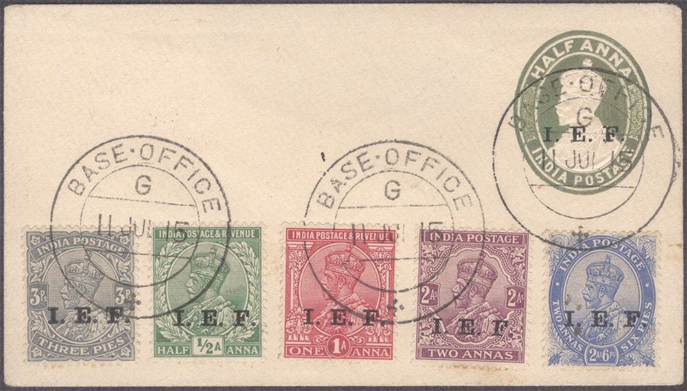 KGV,1915,I.E.F.,1/2a,BASEOFFICE, I.E.F. Overprinted3p, 1/2a, 1a, 2as 2a6padditional Stamps tied up, 11 JUL 15,GoodCondition,Rare.