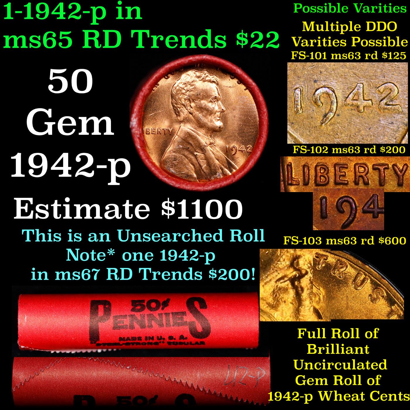 Rare BU Shotgun Lincoln 1c roll, 1942-p 50 pcs Steel-Strong Wrapper 50c