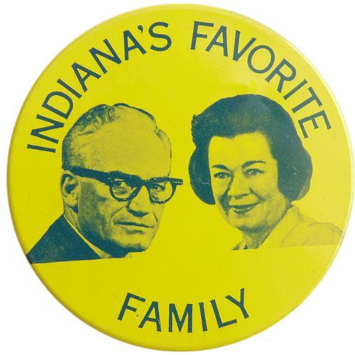<B>Rare Barry and Peggy Goldwater Jugate Button</B></I> The Republican presidential candidate for 1964 is depicted here with his wife as "Indiana's Favorite Family". This 3" button is in very fine condition with just a few light surface scratches and one tiny outward push.