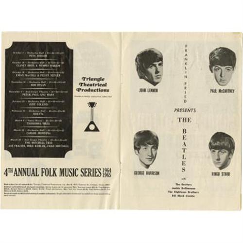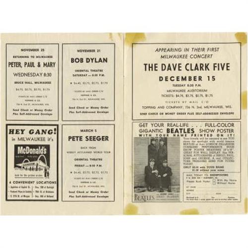 <B>Rare Beatles Program, 1964 Performance in Milwaukee.</B></I> In 1964, on their first US tour, the Beatles made a stop in Milwaukee on September 4, drawing record crowds and further stoking the Beatles' popularity. The tour was a whirlwind: the Boys performed in Indianapolis the day before and would perform in Chicago immediately following the Milwaukee show. This ultra-rare item is the first Heritage has ever seen from this Milwaukee performance. The 6.25" x 9.25" program is full of fascinating details, including adverts for Pete Seeger and Bob Dylan performances, and a full page fan on inner cover promoting the 1964-65 4th Annual Folk Music Series. The show's opening acts included The Righteous Brothers, Jackie DeShannon, The Exiters, and The Bill Black Combo. Though there are areas of tape staining en verso and a minor center fold, this hard to find program is in overall Very Good condition.<BR><BR><b>Shipping:</b> Flat Material, Small (<a target="_blank" href="http://www.heritageauctions.com/common/shipping.php">view shipping information</a>)