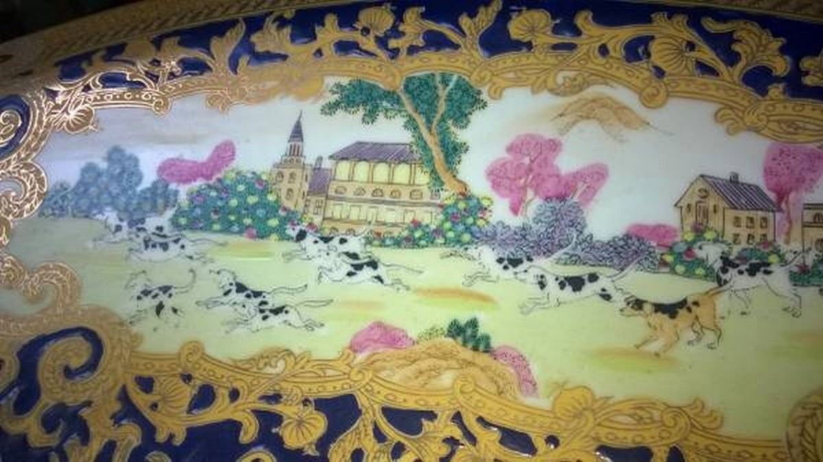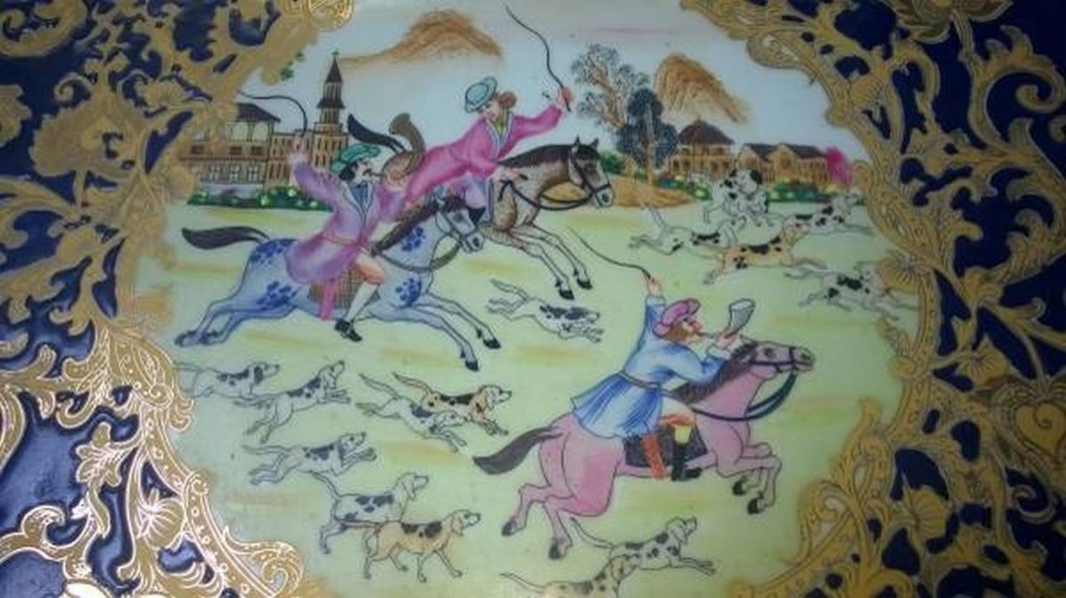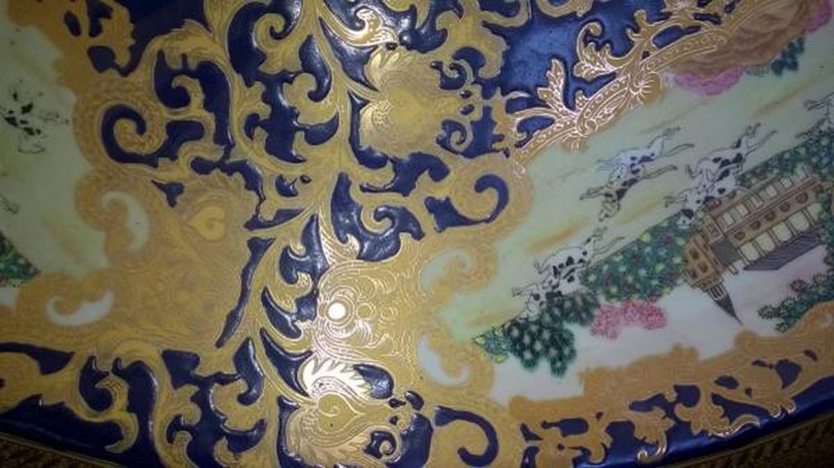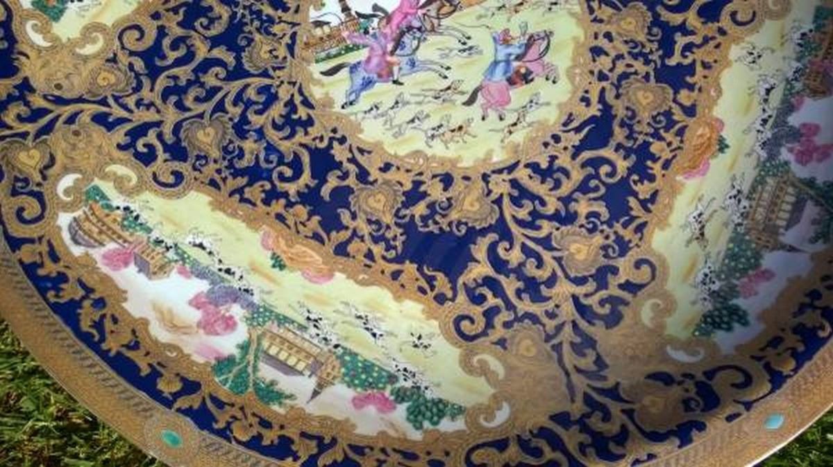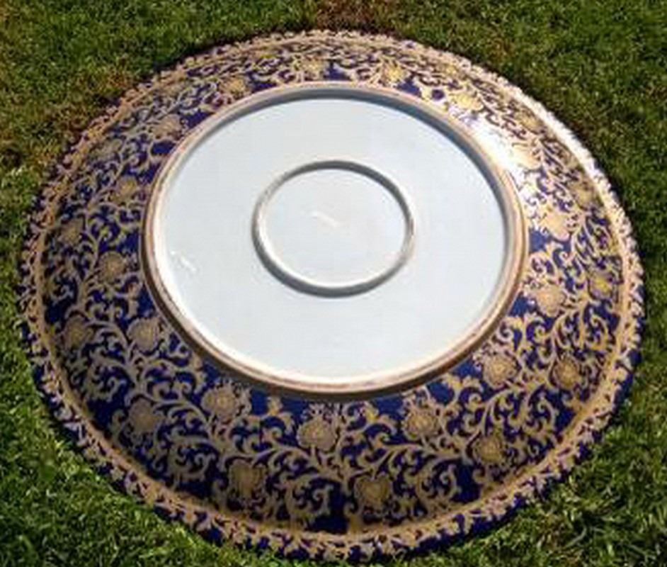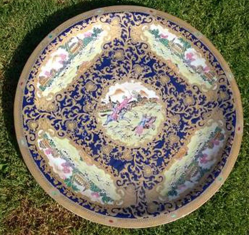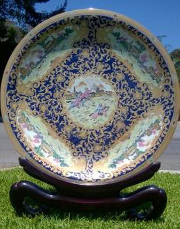 Rare & Beautiful Indo Persian Platter (Porcelain & Enamel Work) with Custom Solid Lacquered Wood Display Stand. Extremely Heavy and 30 inches in Diameter.