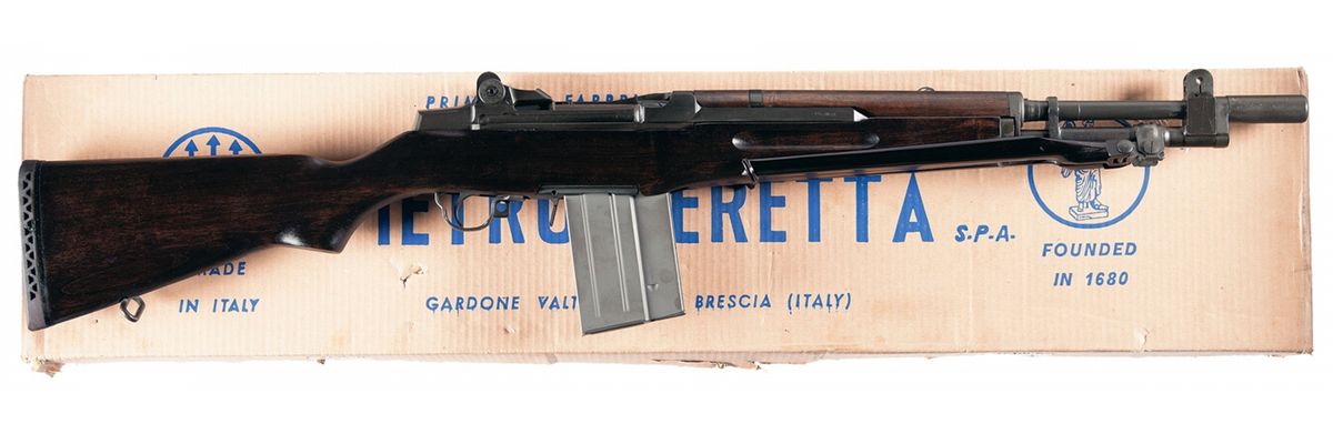 This is a rare rifle with only about 1,500 imported from Italy and was manufactured as the final step in the evolution of the M1 Garand semi-automatic rifle. It has the same style sights with windage and elevation drums marked "PB", there is a folding bipod mounted to the gas cylinder and a sling swivel on the front left side of the stock and a swiveling sling swivel at the toe. The left side of the receiver is marked "BM 69 CAL. 308 W SEMIAUTOMATIC/MADE IN ITALY FOR BENET ARMS CO. AFTON VA 22920". The various small parts are marked "BM 59". Mounted on a dark colored, smooth walnut pistol grip stock with finger grooves and a factory recoil pad. With box numbered to gun and one extra magazine.