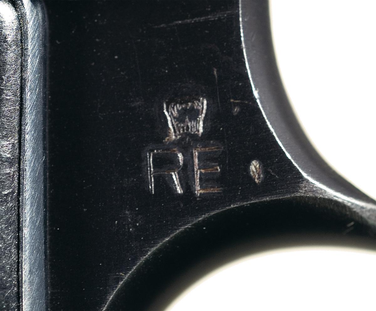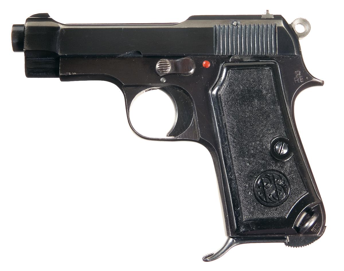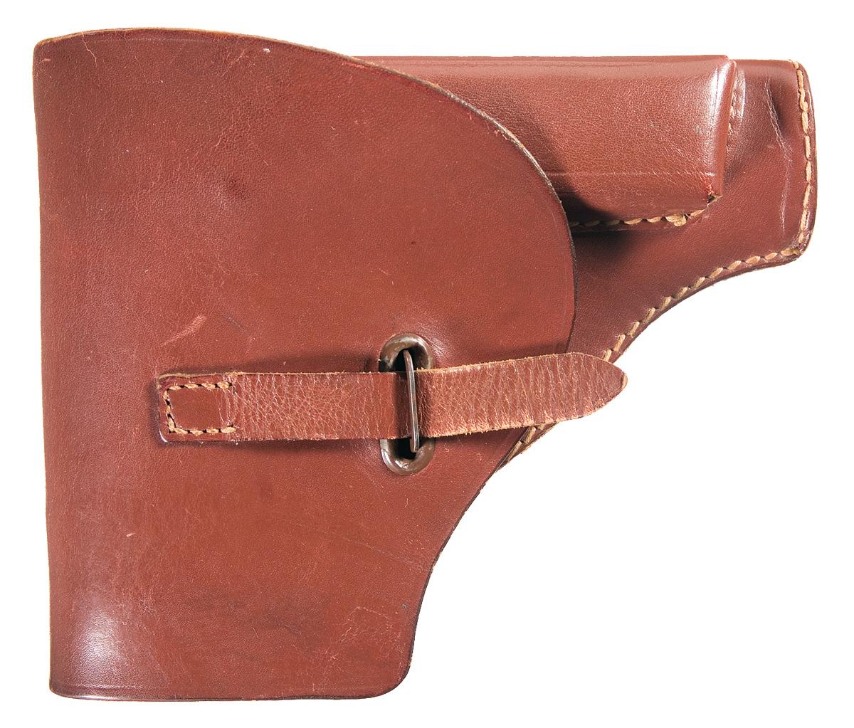This G prefixed serial numbered Model 1935 pistol has a slide without a legend, a common feature for Model 1935s in this serial number range. The left side of the grip tang has the Italian Socialist Republic Army crown/RE marking. Note that a small portion of Model 1934 pistols manufactured during the German occupation have the Italian Socialist Republic Army marking. The right side of the trigger guard is stamped with a boxed "SN". Standard metal backed plastic grips with "PB" emblem. Matching serial number on slide and frame. Complete with a brown leather holster with the inside of the flap stamped with the Torino arsenal marking and "Calsi" handwritten in blue ink.