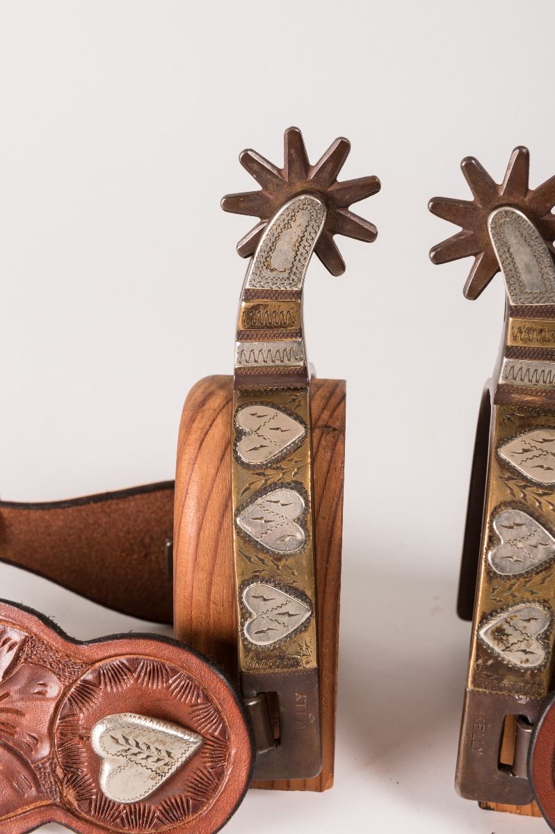 Rare Bill Adamson Spurs. 1 ½", 9 point rowels. Double silver overlaid on "Kelly" blanks with four heart patterns. Well marked "Adamson & Kelly" under the buttons.