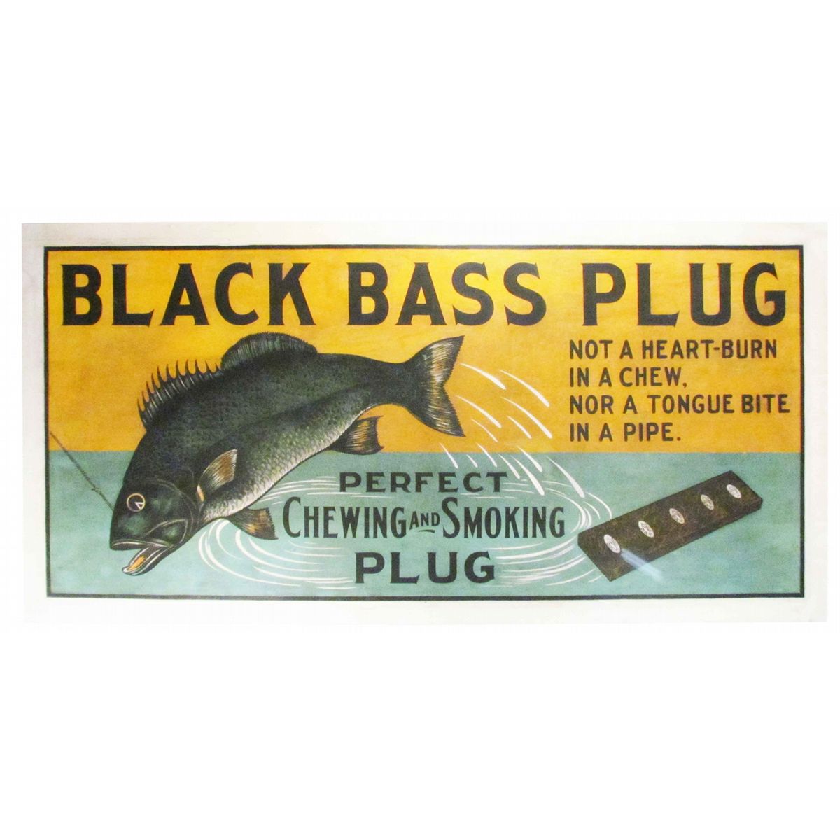 Extremely Rare Black Bass Plug Tobacco Paper Banner. The only one we have ever seen. Linen backed and professionally preserved. 48 X 24 inches.
