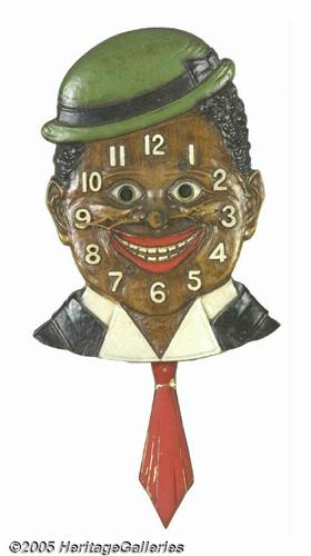 <B>Rare Black Gent Lux Clock with Swinging Tie and Animated Moving Eyes</B></I> When the tie, which is the pendulette, swings it makes his eyes move back and forth. The clock, made by the Lux Clock Manufacturing Company, includes their clock parts and a pressed wood embossed front. Complete and in great condition with original paint, with only a small bit of paint loss on the tie. Lux manufactured these small character clocks until a fire burned all the equipment in 1930. Long noted as one of the most popular of its pendulette line, this happy black man is prized by clock collectors and Black Americana collectors alike. Lot:250