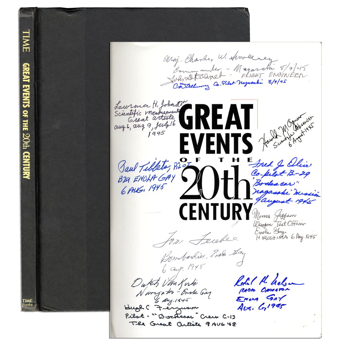 Twelve crew members of the Enola Gay and Bockscar planes that dropped the WWII-ending atom bombs sign the book, ''Greatest Events of the 20th Century.'' Time Books: New York: 1997. The autograph inscriptions appear on the fly-leaf and include: ''Maj. Charles W. Sweeney / Commander - Nagasaki 8/9/45'', ''John D. Kuharek - FLIGHT ENGINEER'', ''CD Albury Co-pilot Nagasaki 8/9/45'', ''Harold M Agnew / Scientific Observer / 6 August 1945'', ''Fred J Olivi / Co-pilot B-29 / 'Bockscar' / Nagasaki Mission / 9 August 1945'', ''Morris Jeppson / Weapon Test Officer / Enola Gay / HIROSHIMA 6 Aug 1945'', ''Richard H. Nelson / RADIO OPERATOR / ENOLA GAY / Aug 6 1945'', ''Hugh C. Ferguson / Pilot - 'Bockscar' Crew C-13 / The Great Artiste 9 Aug 45'', ''Dutch Van Kirk / Navigator - Enola Gay / 6 Aug 1945'', ''Tom Ferebee / Bombardier, Enola Gay / 6 August 1945'', ''Paul Tibbets, Pilot / B29 ENOLA GAY / 6 Aug. 1945'' and ''Lawrence H. Johnston / Scientific Measurements / Great Artiste / Aug 6, Aug 9, July 16 / 1945''. The article on the first use of nuclear weapons appears on pp. 32-33 of the 186pp., 8.25'' x 11'' book. Black paper boards with gilt lettering to spine. In very good condition with only light bumping to boards.
