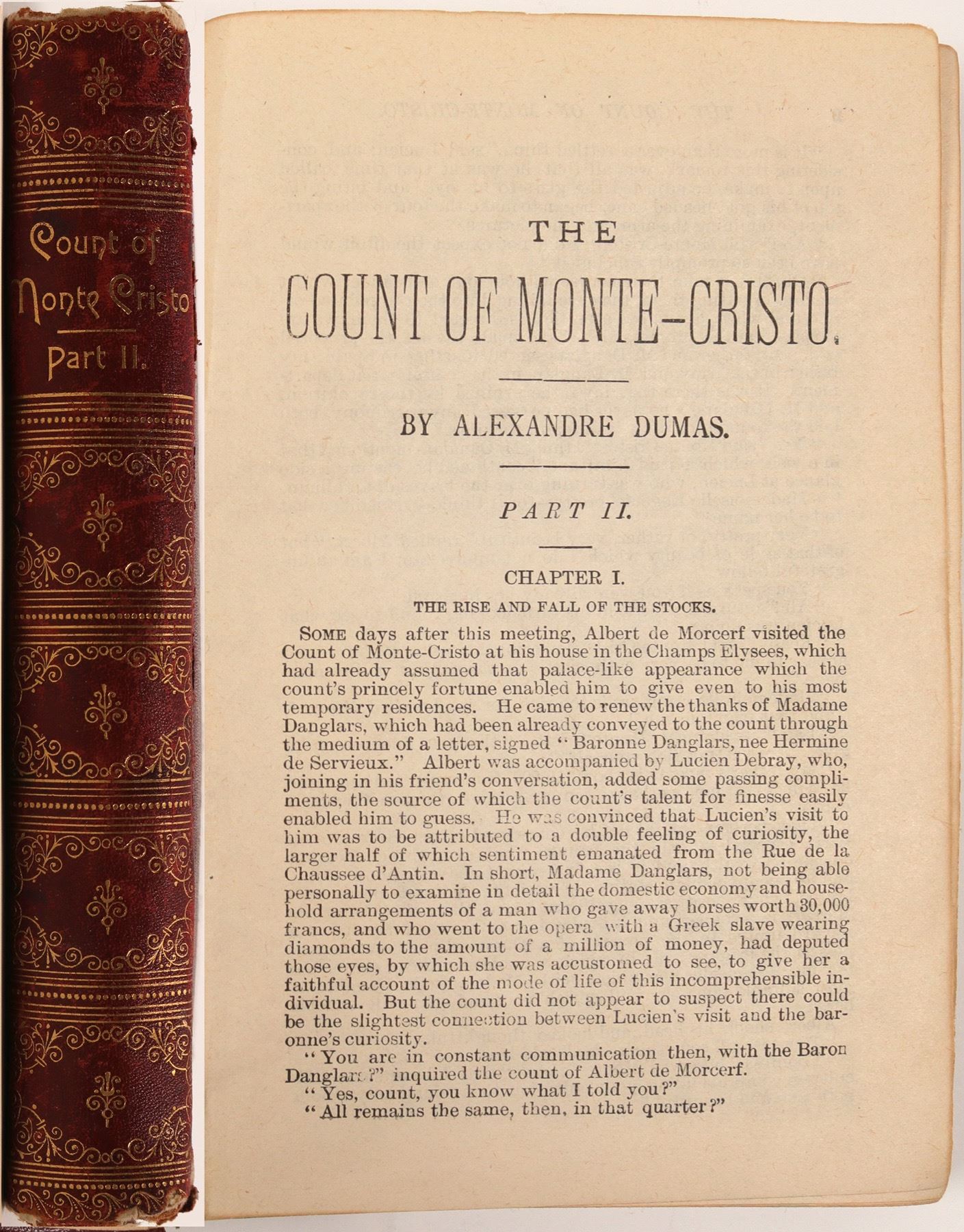 Here is a real treasure, that is for sure. It is a book entitled " The Count of Monte Cristo". This is only part two, part one is missing. But, it is the early revision of the French novel, with correction in the name from " Christo " to " Cristo". Plus , there is the chapter entitled " The House On The Allees de Meilhan "included in this volume. Also, it has NO, illustrations.Published by Chapman & Hall, but not embossed ! In 1889, the publisher " Little Brown", updated this earlier revision, and removed the chapter" The House On The Allees de Meilhan", and the last chapter was " The Departure". The binding is in fair to good condition, considering the age of the item. In side the front cover is the signature" Chas. Lake / Reno/ Nv./ Oct 14 1895 !! So, this volume can not be the 1889 revision, because it does have the additional chapter that was added in 1846, but removed in 1889 !! Also, all the pages have an unusual design on the ends, to match the front and back cover. very interesting item.Anyone out there have , part 1 ? ( RH)