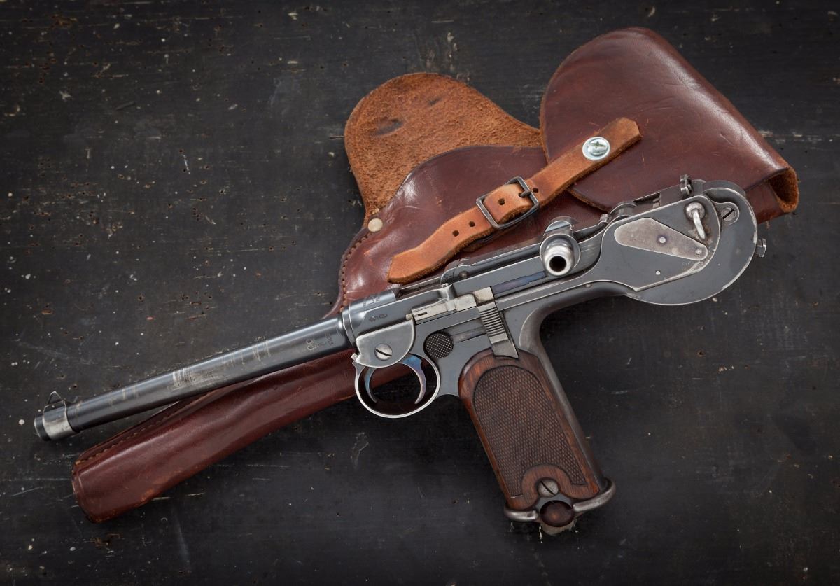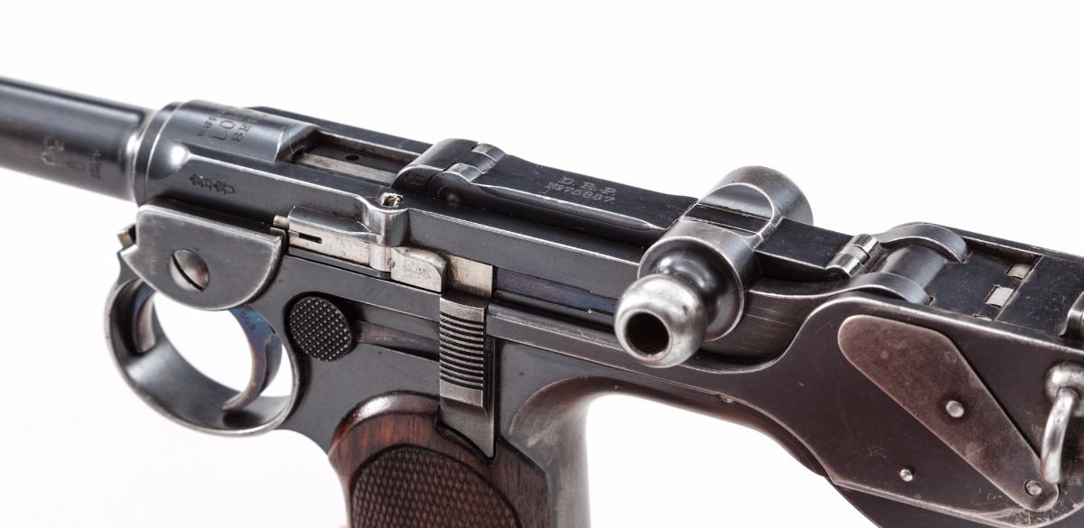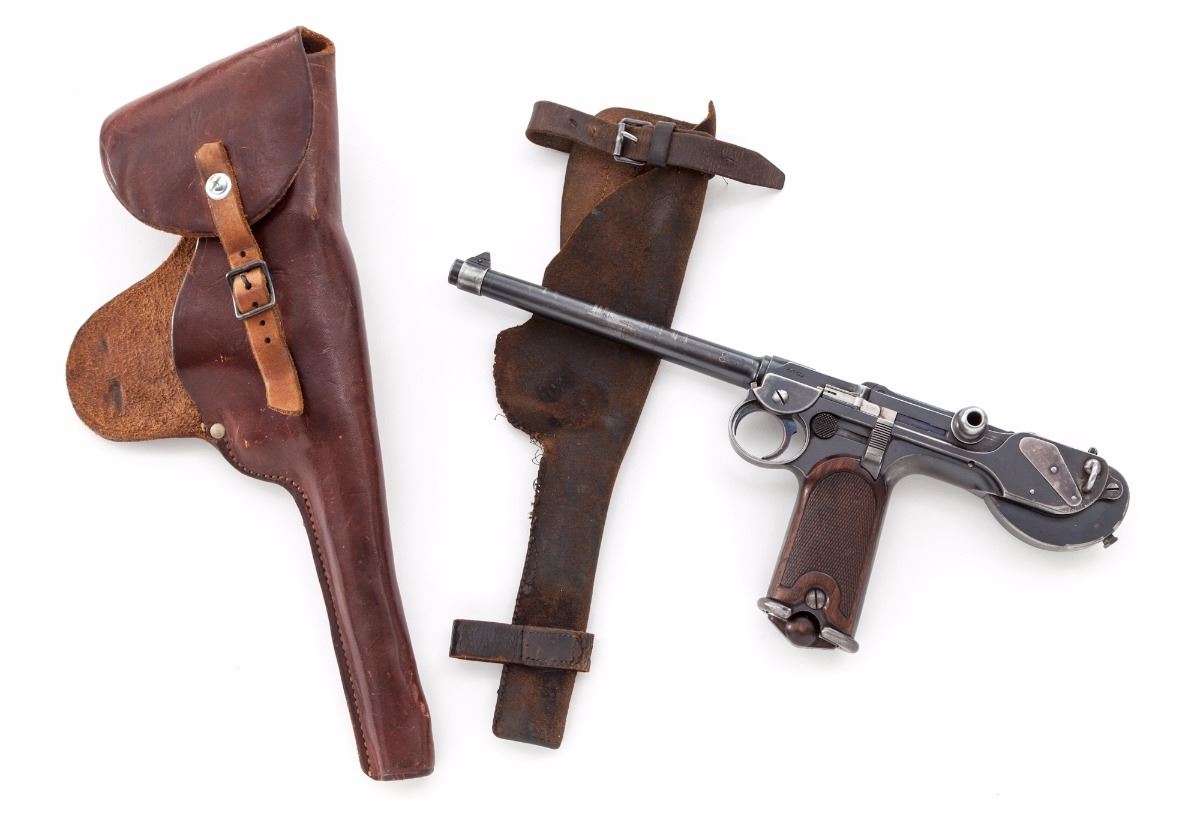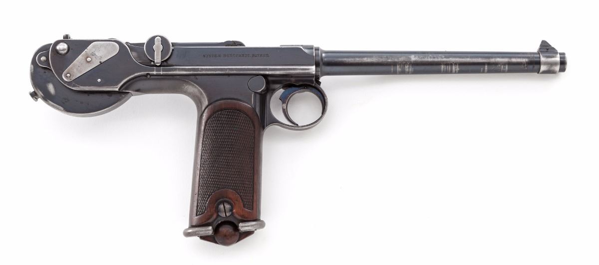 Rare and Desirable Borchardt Model 1893 Semi-Automatic Pistol, with two period holsters, #562, 7.65x25mm Borchardt, 7-1/2'' barrel, blue finish with straw and niter-blue small parts, finely checkered walnut grips with smooth border, right side of frame is marked with ''System Borchardt.Patent.'' markings; top of toggle marked ''Waffenfabric/Loewe/Berlin''; ''(crown)/BUG'' proofmarks to both barrel and upper receiver, with one matching numbered magazine.  Includes one original factory holster as removed from the wooden stock (stock not present), and one early 20th Century unmarked brown leather holster with repair.   Condition is about fine retaining approx. 85% thinning factory blue.  Barrel shows circumferential scratches and light pitting that has been cleaned to left side.  Frame with high edgewear; front and backstrap have thinned to approx. 30%.   Grips with moderate even flattening to checks with no losses or fractures.  Screw slots are good with the exception of the transfer bar to top of frame.  Trigger hair return spring is missing (easily fabricated).  Action functions as designed, bore is fine.    Original holster removed from wooden stock shows approx. 75% loss of its original tanned finish, with some repairs along bottom edge forward of triggerguard, which have since come unraveled; buckle hardware is good.  Later non-factory brown leather holster remains in fine condition and appears to be of American mfg.  Strap has been replaced and fastened with a hardware store type screw, which would take very little effort to correct. An untouched excellent example of an early successful semi-automatic pistol.  Est.:  $15,000-$20,000.  (Antique)
