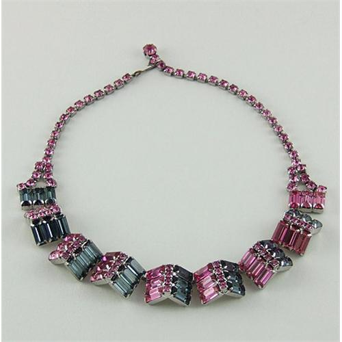 three-dimensional, cubist-style choker. There are 7 triangles with fuschia on one side & smoky blue on the other. Down the middle of each triangle are 4 round fuschia stones. All the Marcel Boucher stylistic hallmarks are evident: His fascination with unusual, moving structures, the attention to detail in the prong setting, and above all else: STYLE, STYLE, STYLE! Slight wear to foil on one fuschia baguette. It's very easy to see why this was a prototype and not a production piece: The hinges make this necklace a production nightmare. Stunning detail,