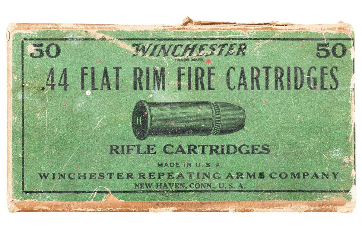 Brown cardboard construction, with a green top label bearing a picture of the cartridge and marked "50 WINCHESTER 50/.44 FLAT RIMFIRE CARTRIDGES/RIFLE CARTRIDGES" above the New Haven address, and a pair of orange end labels with a red "W" behind "44 FLAT/Rim Fire/Cartridges." The box contains all 50 rounds.