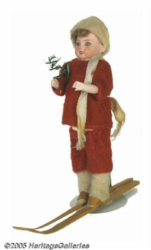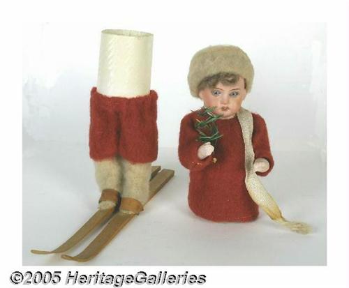 <B>Rare Boy on Skis Victorian Candy Container</B></I> In near excellent condition, with his porcelain face and glass eyes adding to the detailed costume and wooden skis. The off-white scarf has some discoloration on the back, but does not distract from the container's near mint appearance. The boy separates at the waist, where the treats can be hidden in his cylinder-like middle. Clever gift of toy and sweet treat for any Victorian child. This piece would fit into any decorator's Christmas decor or even appeal to a doll collector due to its detail and execution. Lot:252