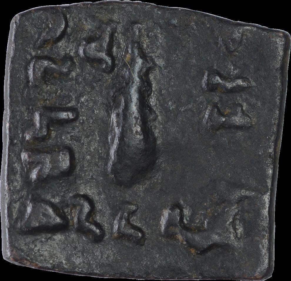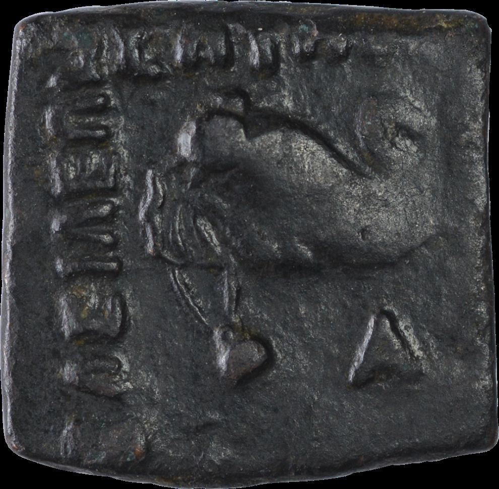 Indo-Greek, Menander I, Bronze Unit, Obv: elephant head three quarters right, english A letter below, greek legend on three sides, Rev: club in center, monogram at right, kharosthi legend at right, 1.62g,14.25 x 14.00mm, about very fine, Rare.