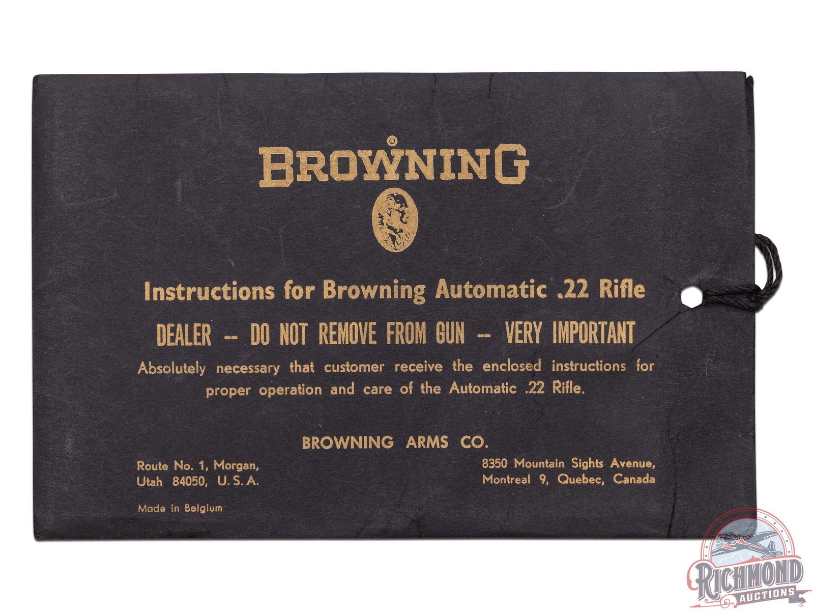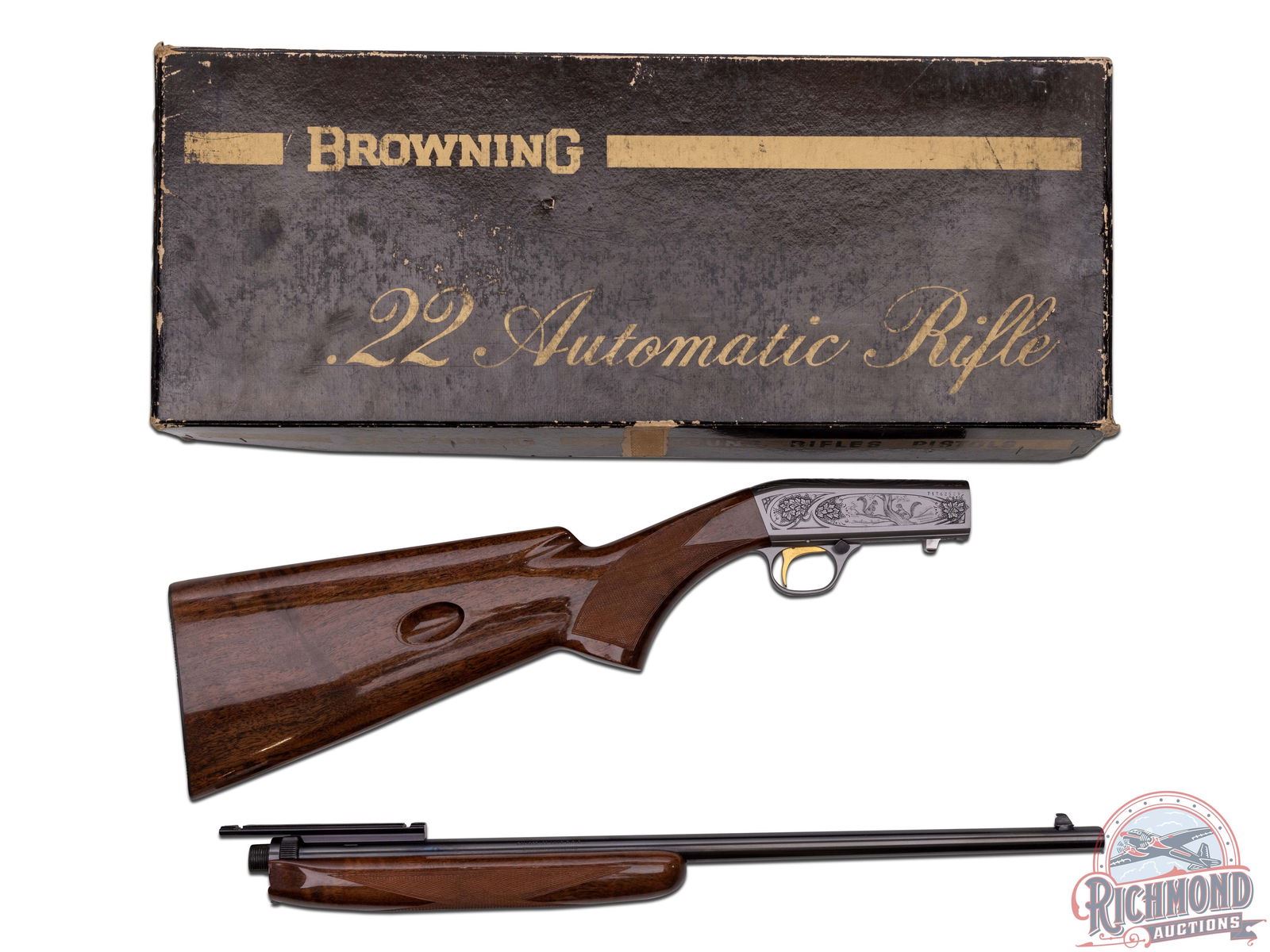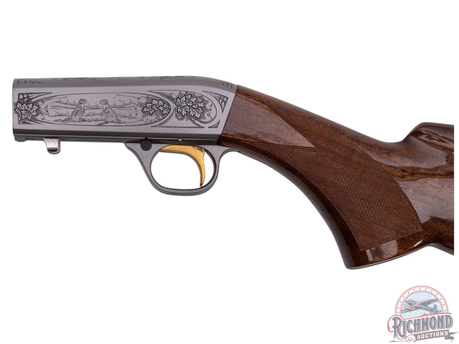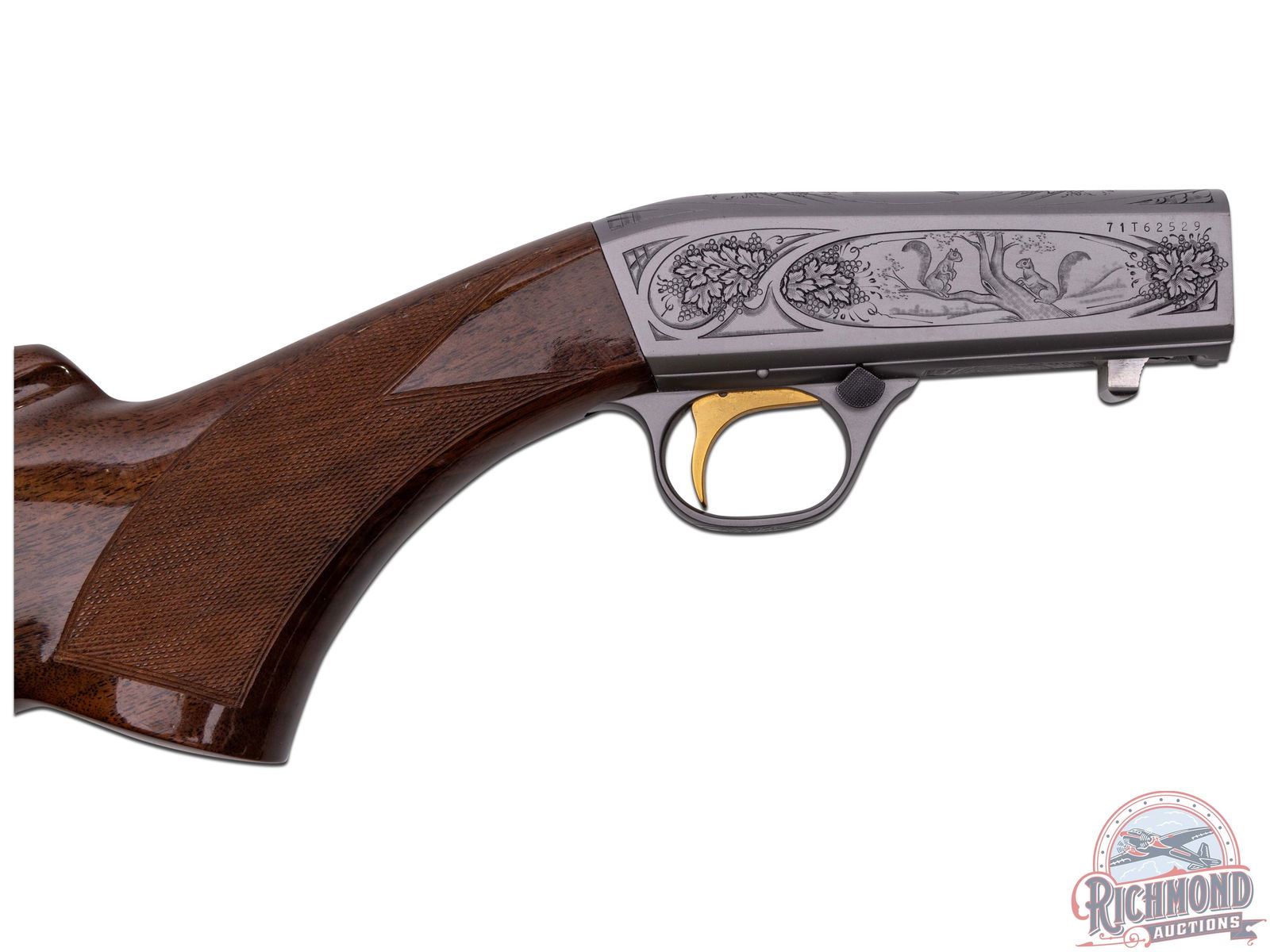 Manufactured in 1971 by FN in Belgium. Features a 19" blued round barrel stamped with single line Browning address. Equipped with a Weaver 60A scope rail and original blade with brass bead front sight. Coin finished receiver features a full signature by Master Engraver R.Coenen. Grade II rifles with a full signature are very rare. Left side features two groundhogs in a field in an oval bordered with grape leaf design and signed "R.COENEN". Top of the receiver features a duck center of a grape leaf design. Right side features two squirrels on a tree limb in an oval bordered with grape leaf design. Bottom of the trigger guard is engraved with the same grape leaf design. Gold washed trigger and crossbolt safety. Grade II walnut high gloss stock and forearm with hand-checkered pistol grip and matching checkering on the base of the forearm. Comes in the original factory box with manual. CALIBER: 22 LR. S/N: 71T62529. FFL STATUS: Curio & Relic.