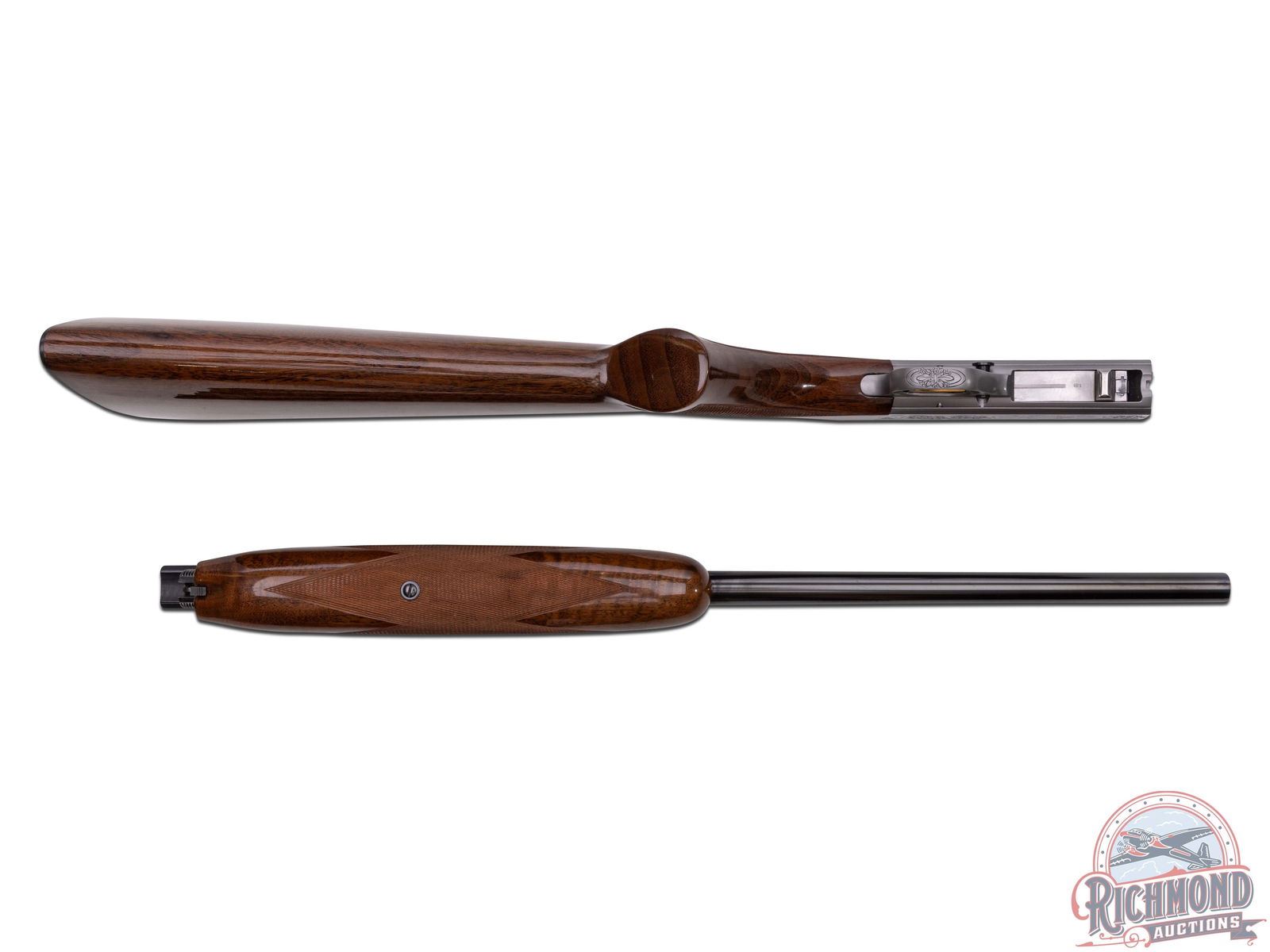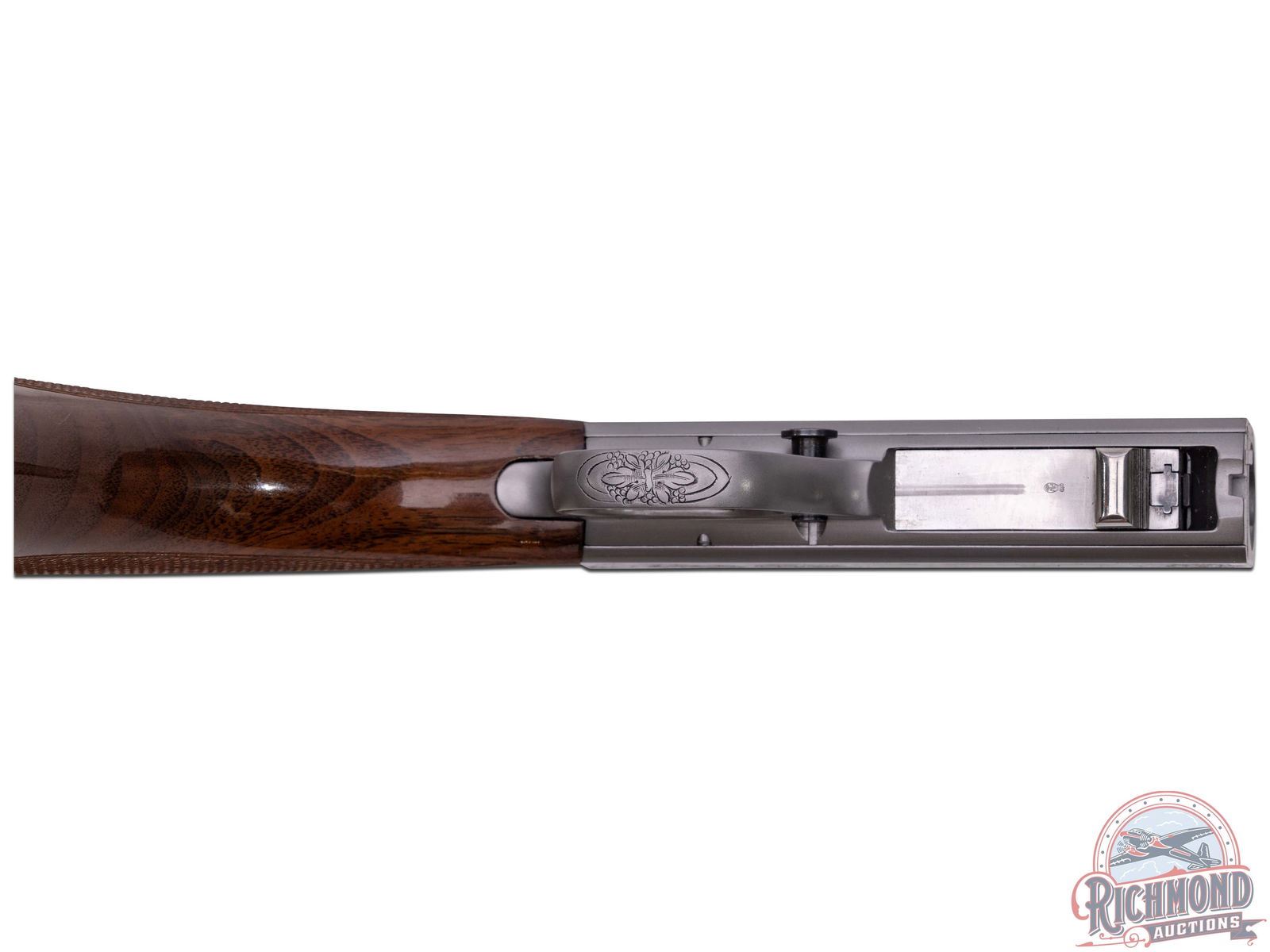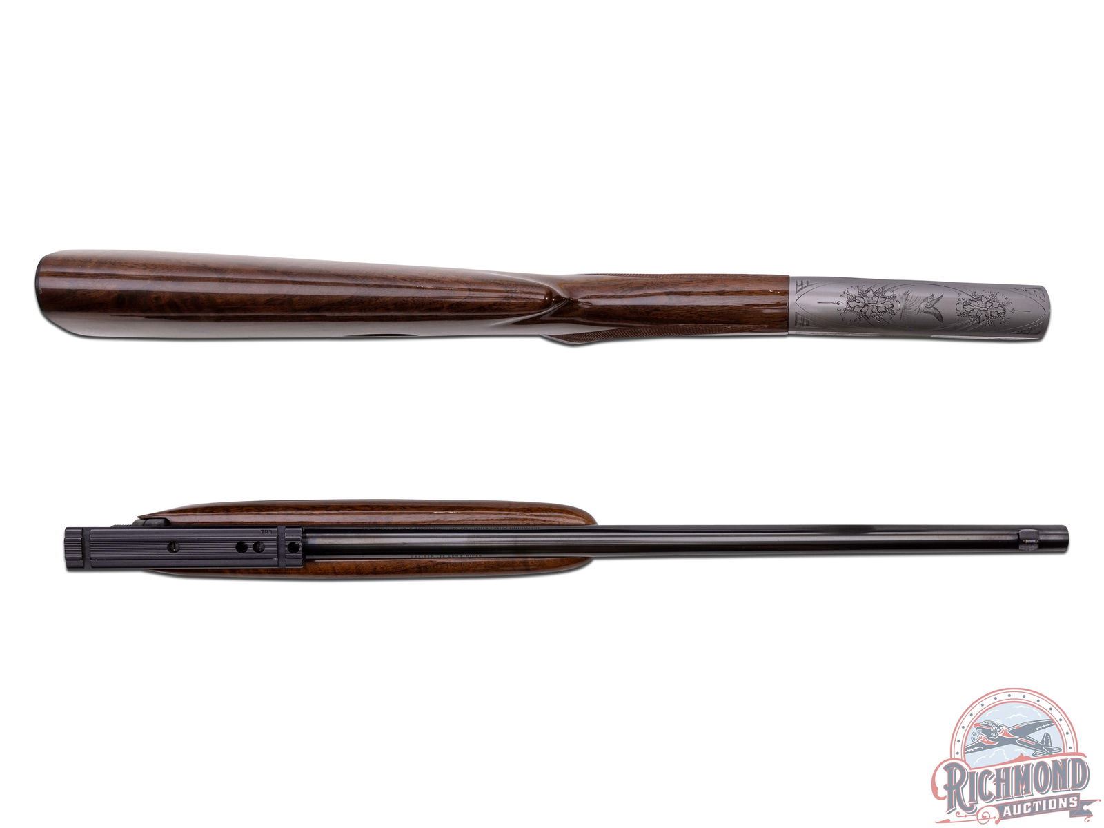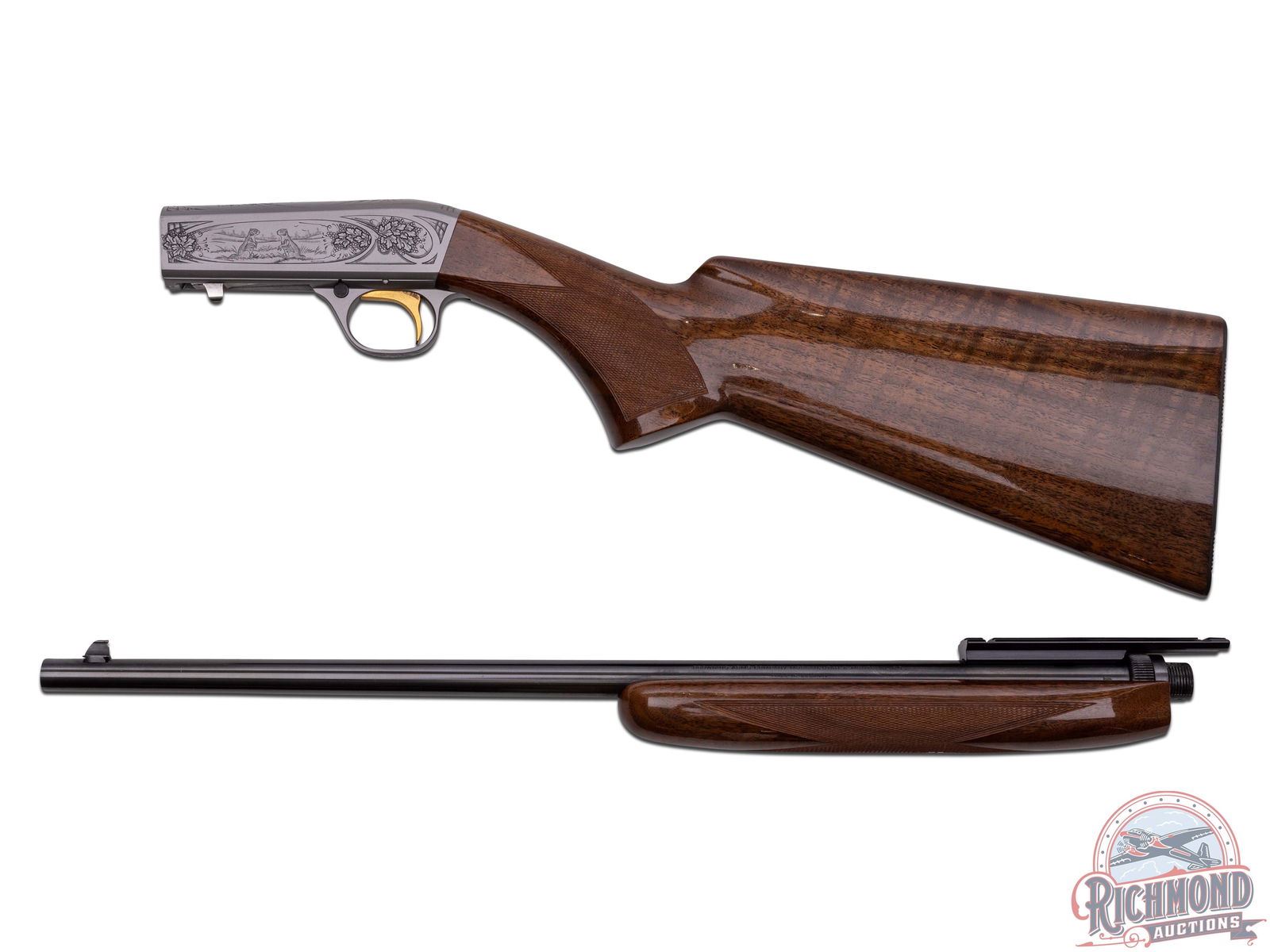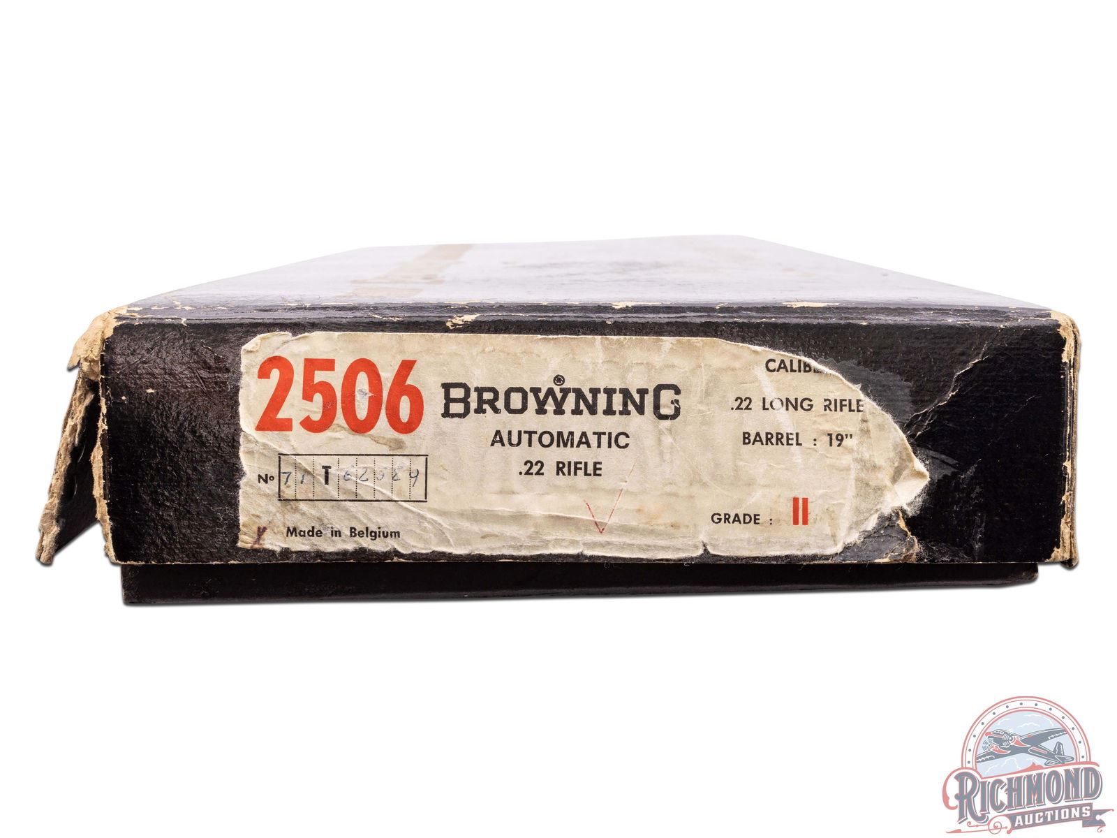 Manufactured in 1971 by FN in Belgium. Features a 19" blued round barrel stamped with single line Browning address. Equipped with a Weaver 60A scope rail and original blade with brass bead front sight. Coin finished receiver features a full signature by Master Engraver R.Coenen. Grade II rifles with a full signature are very rare. Left side features two groundhogs in a field in an oval bordered with grape leaf design and signed "R.COENEN". Top of the receiver features a duck center of a grape leaf design. Right side features two squirrels on a tree limb in an oval bordered with grape leaf design. Bottom of the trigger guard is engraved with the same grape leaf design. Gold washed trigger and crossbolt safety. Grade II walnut high gloss stock and forearm with hand-checkered pistol grip and matching checkering on the base of the forearm. Comes in the original factory box with manual. CALIBER: 22 LR. S/N: 71T62529. FFL STATUS: Curio & Relic.