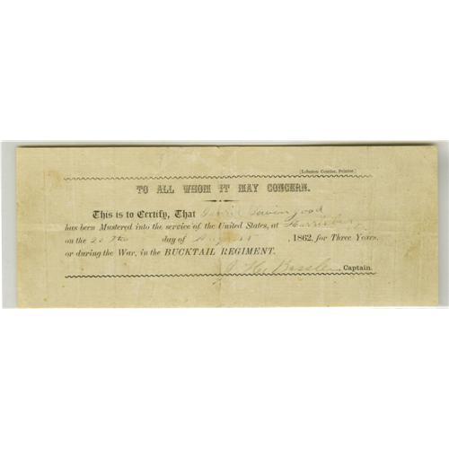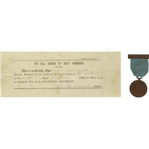 <B>Rare Bucktail Document and Medal, along with a fine 5th Corps Bucktail "Proof of Enlistment" Gettysburg 25th Anniversary Medal for the 149th Pennsylvania Bucktails 1863-1888.</B></I> The document, one of only a few known measures 3¼ x 8½ and reads "<I>To all whom it may concern - this is to certify that Gabril Livengood has been mustered into the service of the United States at Harrisburg on the 20th day of August, 1862, for three years or during the war, in the Bucktail Regiment.</B></I>" This document is signed by J. H. Bassler who was severely wounded at Gettysburg. Livengood survived Gettysburg and stayed in for the whole war, mustering out on June 24, 1865.<BR><BR><b>Shipping:</b> Large Flat (<a target="_blank" href="http://www.heritageauctions.com/common/shipping.php">view shipping information</a>)