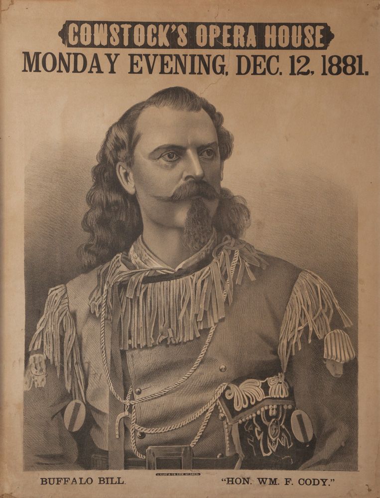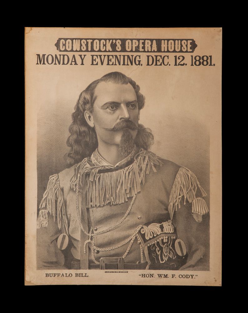Rare Buffalo Bill Broadside. Comstock's Opera House poster for the "Buffalo Bill - Hon. Wm. F. Cody." performance. "Monday Evening Dec. 12, 1881". By A. Gast & Co. Litho. St. Louis. Cody in a regal pose, wearing a fringed Scout shirt with a double brace of revolvers at his sides. A very scarce lithograph. Overall in very good condition, mounted on hard board. 25" x 19".