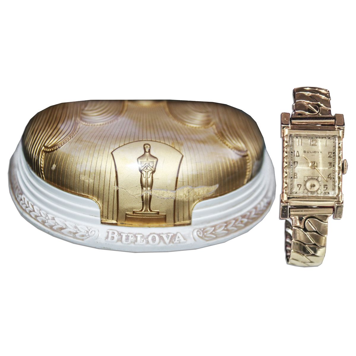 Academy Awards Bulova vintage 1952 timepiece housed in its original case. Watch-maker Bulova forged a licensing agreement with The Academy of Motion Picture Arts & Sciences, resulting in production of the Oscar line of wristwatches. ZZ model watch is one of approximately 40 different models sold during the four or so year term of the licensing deal. With Bulova dating code of ''L2'', indicating 1952 as the year of manufacture. Watch features a 10k gold filled tooth-ribbed bezel, with silver sand dial and quartered crystal. Features a 21 jewel movement, 1947 7AK Bulova. Bracelet by Speidel is expandable. Bezel measures 1.5'' x 0.75''. Chipping to lower right corner of crystal, else near fine. Housed in its original case. Delightful watch case in art deco style features a semicircular shape and lid made as an intricate theatre curtain in gilt with Oscar statue taking center stage, all under a lucite shell. Lid closes on a cream plastic base with Bulova brand name at center under Oscar. Case opens to a lining of fuscia velour. Case measures 5.75'' x 3'' x 1.75''. Small flaw to the lid under the lucite, else near fine.