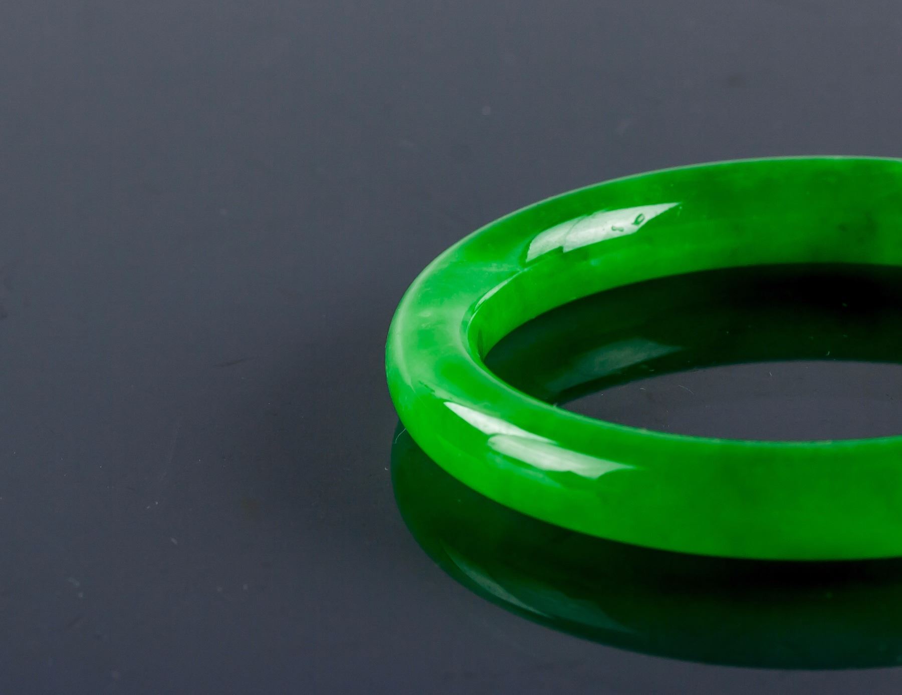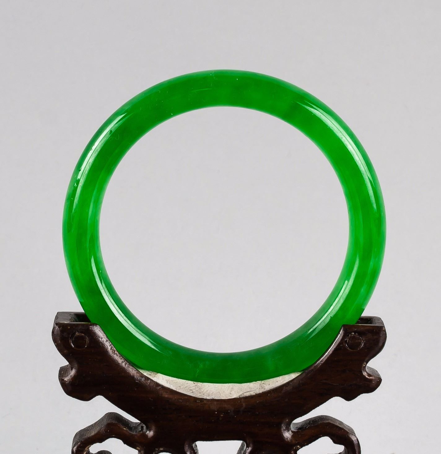Burma green jadeite bangle; accompanied with appraisal certificate numbered 01201102017-08/33113, dated 15 November 2017, of light to medium apple green with natural striations and white grey to medium green mottling; no indications of impregnation, treatment, or polymer with spectrometer reading of 692 nm indicating natural jadeite, “A Jade”; tumbled and polished to a very good lustre; Inner Diameter: 58.06 mm, Outer Diameter: 75.94 mm, 47.90 grams, Density: 3.30