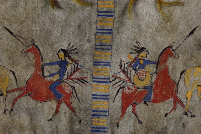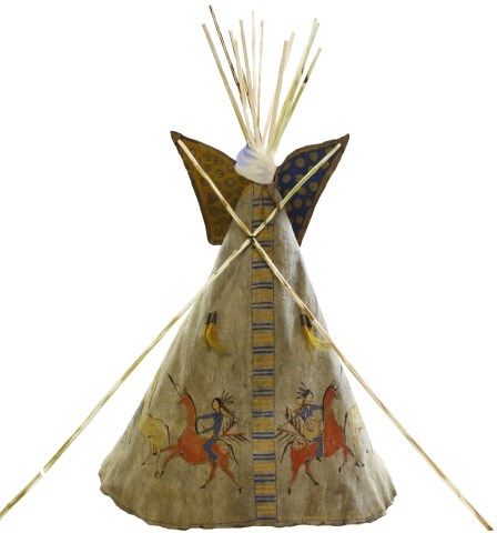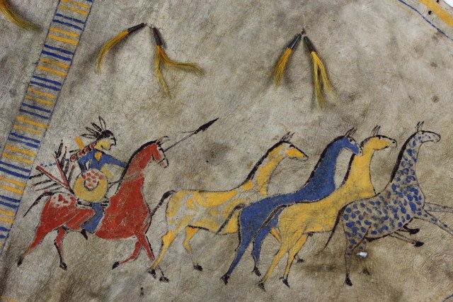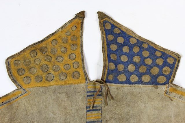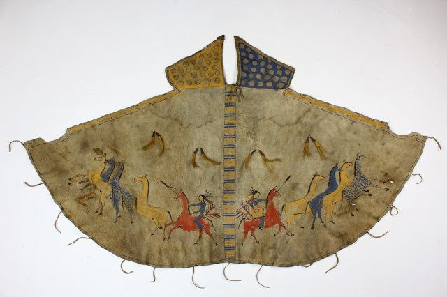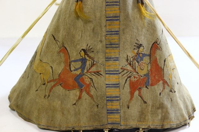 in native tanned leather, approx. 20" diameter X 22" tall, not including poles, right and left side depict warriors steeling horses, upper flaps sinew sewn with yellow and blue circle designs, horizontal stripes around perimeter, alternating blue and yellow, 8 horse hair tin cone dangles, tie string at bottom edge. Overall condition remains very good, some staining and small 2 small holes consistent with age. Est. 4500-9000