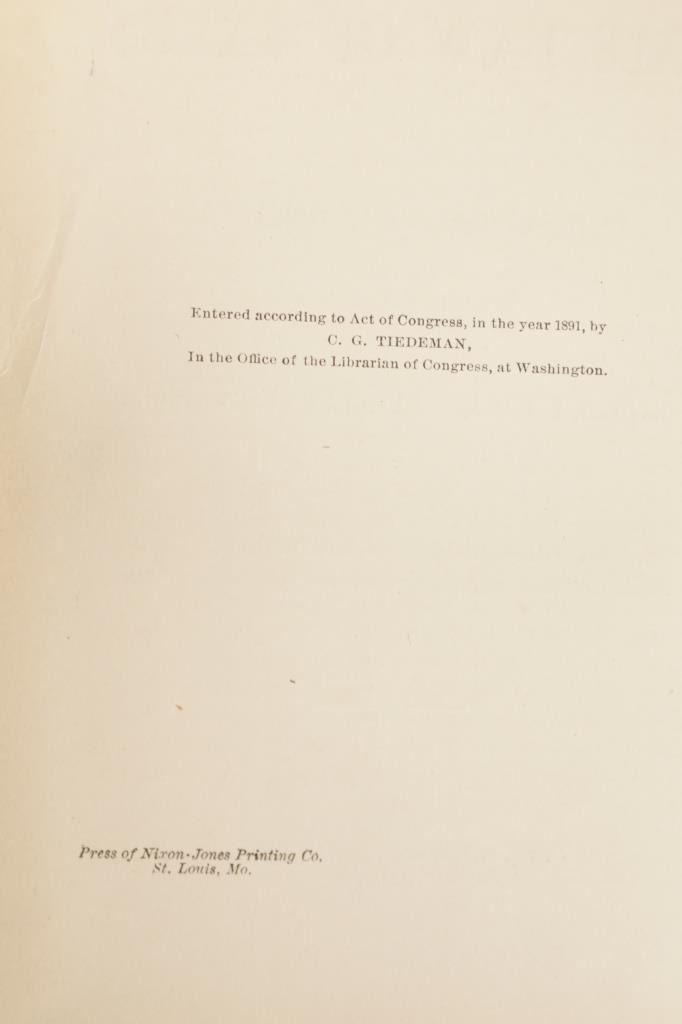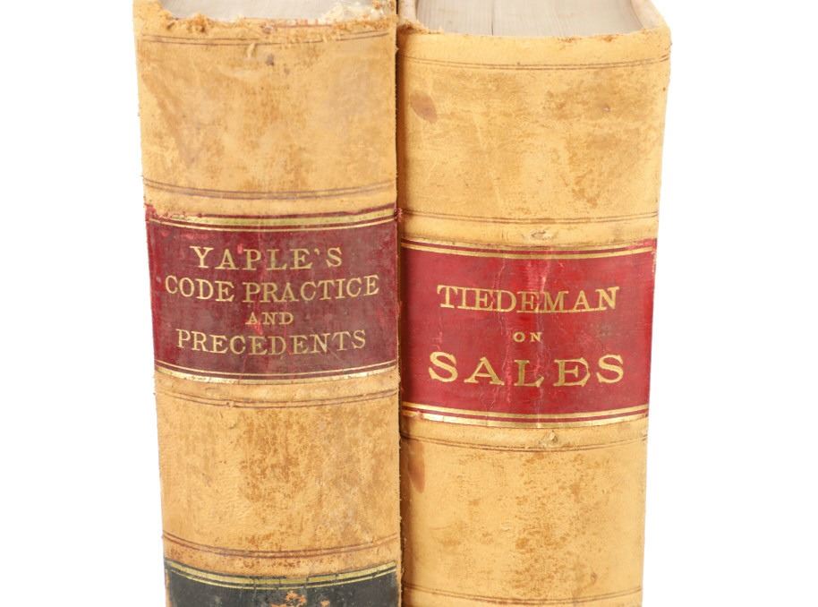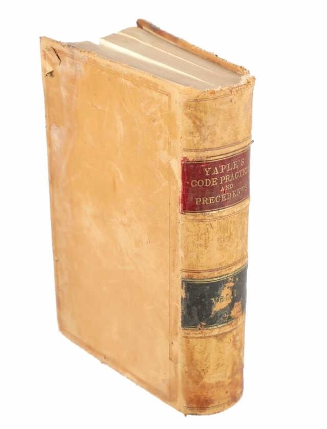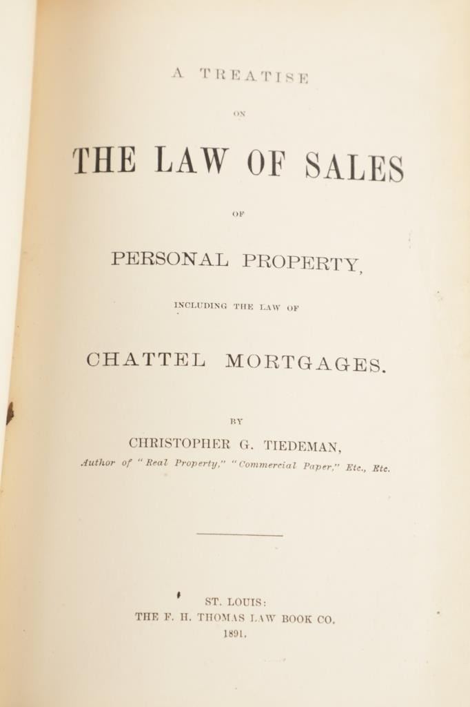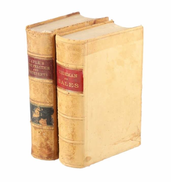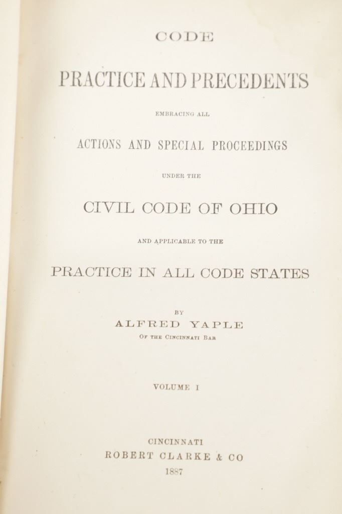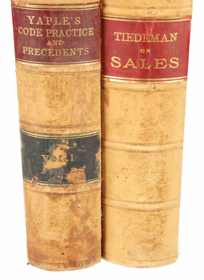 Offered in this lot are the Rare, "A TREATISE ON THE LAW OF SALES OF PERSONAL PROPERTY, Including the Law of Chattal Mortgages", 1891, by Christopher G. Tiedeman, F. H. Thomas Law Book Co., St. Louis, MO., and, "Yaple's Code Practice and Precedents Volume 1, 1887, by Alfred Yapel of the Cinncinatti Bar, publisher Robert Clark and Co. Cinncinatti". Both of these original full leather binding books are exceedingly rare, usually only available in modern softcover version reprints. Staples of civil law jurisprudence, these books would have been fixtures in the office and or personal libraries of every attorney from the end of the 19th century until the arrival and availability of the worldwide web, as well as major public libraries. Both books are in fair to good overall condition, the the the full leather bound hardcovers exhibit moisture and scuffing marring, gold gilt spine lettering is mostly intact. Intact pages feature age tanning with minimal foxing noted. No other obvious marring noted. Yaple's measures 6.25"W x 9.5"L x 2.25"D, Tiedeman's measures 6"W x 9.25"L x 2"D