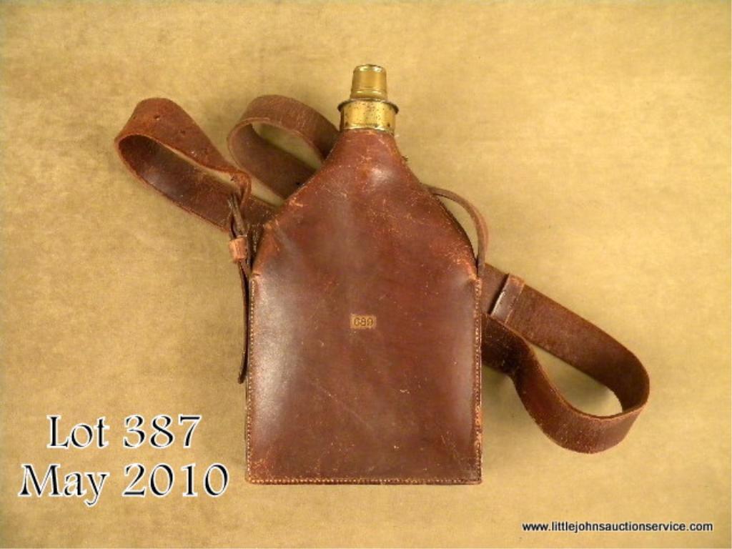 Rare C. & J. W. Hawksley leather shoulder flask with brass charger that retaining a small metal padlock and key, approx. 10” x 5-1/2”. The leather body of the flask is in overall very good condition showing some slight wear to the topportion of the body; very good marked brass charger and padlock and a good leather carry strap that has its original two metal buckles and some areas of wear to the strap near the buckle attachment tongue. There is also what appears tobe an old collection or museum tag “689” affixed to the body of the flask. From the Estate of C.W. Slagle. Est.: $350-$700.