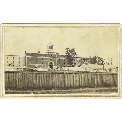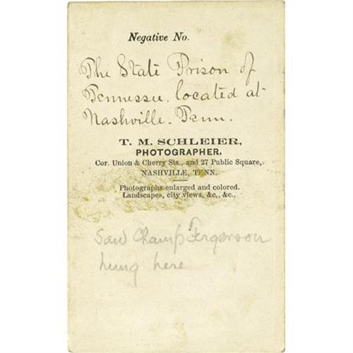 <B>Rare CDV from Tennessee State Penitentiary.</B></I> Used as a P.O.W. prison and site of Champ Fergerson's hanging, the Tennessee State Penitentiary is captured in this rare CDV, showing the outside of the penitentiary and its walls. Photographed by T. M. Schleier in Nashville. The reverse reads, "<I>The state prison of Tennessee located at Nashville, Tenn. - saw Champ Ferferson hung here</B></I>". Fine, strong image.<BR><BR><b>Shipping:</b> Small Flat (<a target="_blank" href="http://www.heritageauctions.com/common/shipping.php">view shipping information</a>)