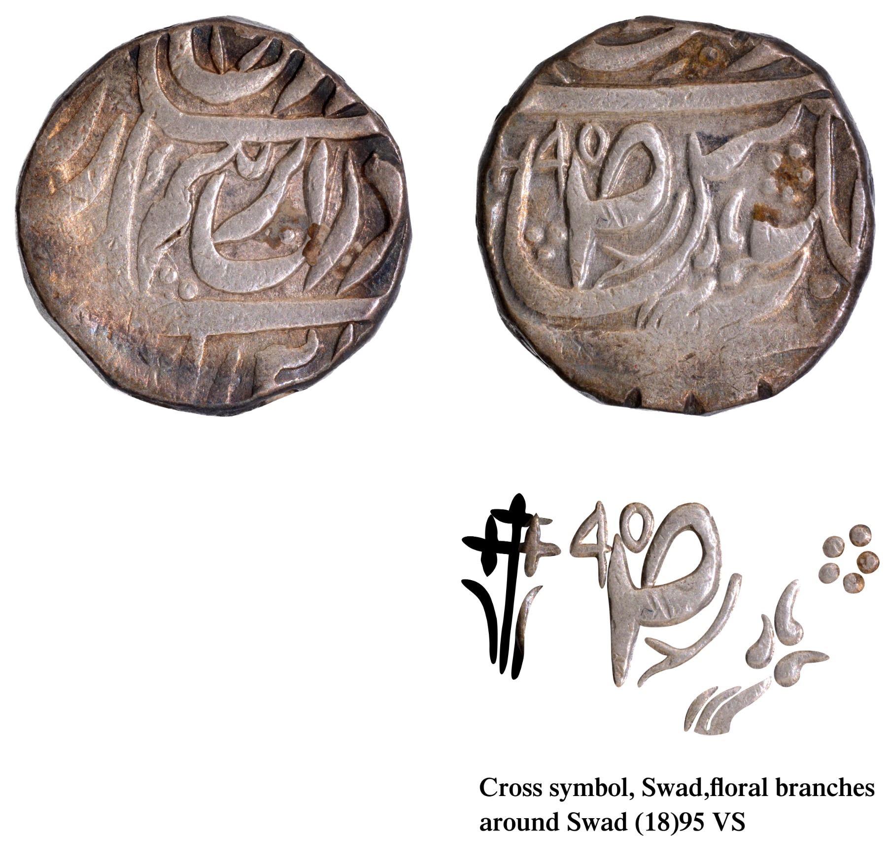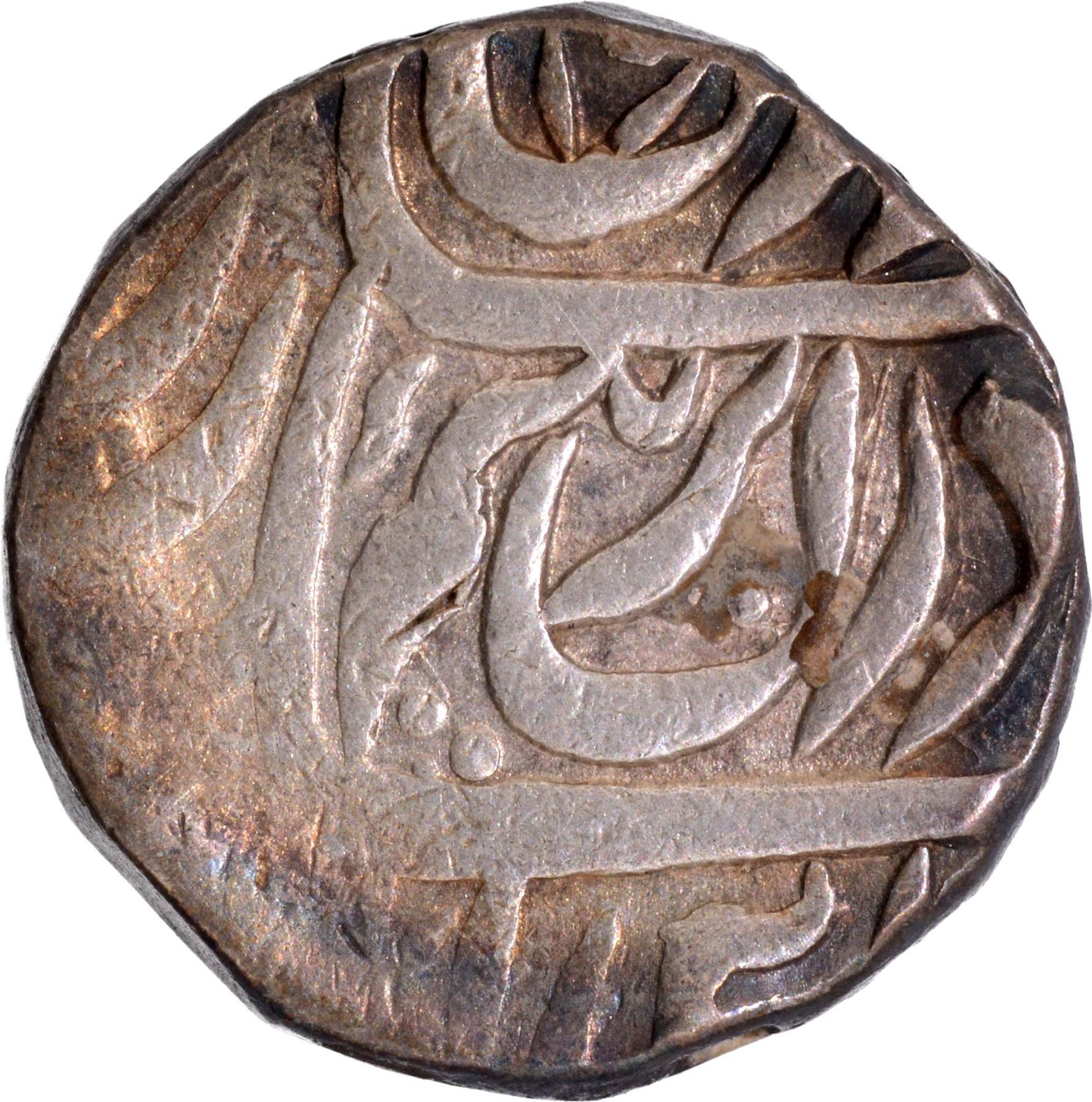 CIS-Patiala, Karam Singh (AH 1229-1261 /1813-1845 AD), Sahrind Mint (off flan), Silver Rupee, 'Qadir-e-Bechun' Couplet, VS (18)95 (1838), In the name of Ahmad Shah Durrani, Obv: Persian legend "hukm shud az qadir-e-bechun ba Ahmad Badshah, sikka-e-zan bar seem-o-zar az auj mahi ta bamah”, Rev: a symbol of "swad" in Persian letter 'seen' of Julus, cross symbol at the left of ‘seen’ of ‘Julus’, Vikram Samvat year 1895,"zarb Sahrind" off flan at the bottom, 11.1g 19.14mm, (Unlisted in KM / Saran & Dalwinder # PT12md), test marks on edge, about extremely fine, Rare.