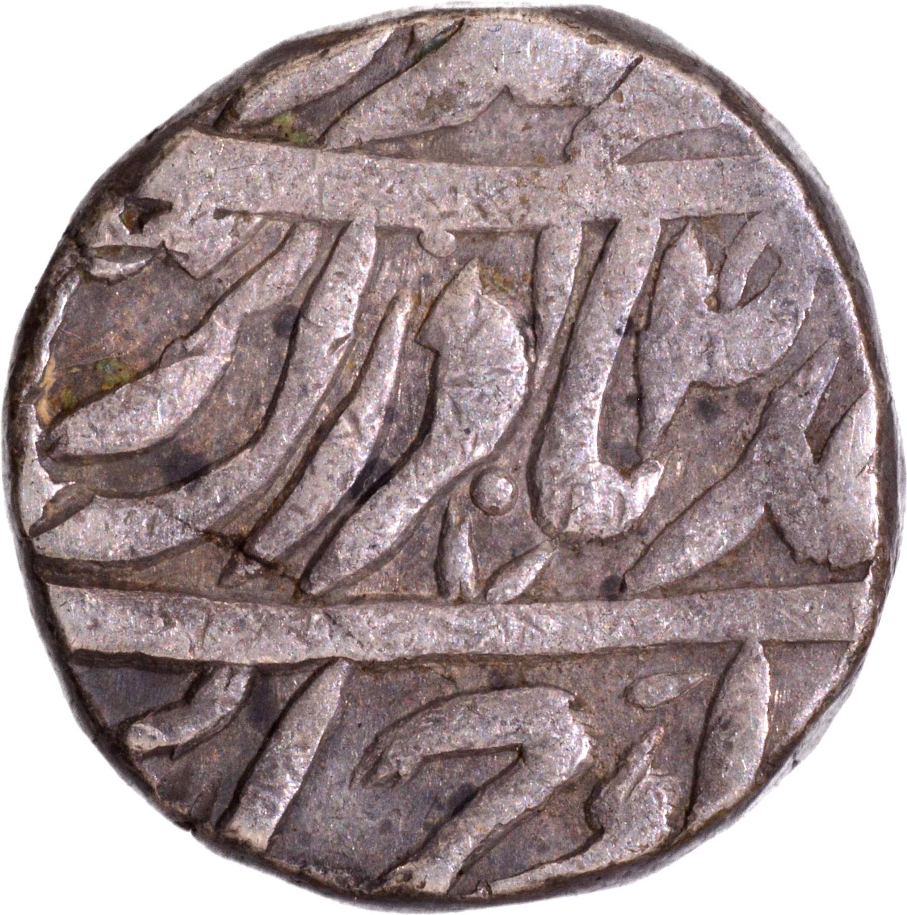 CIS-Patiala, Karam Singh (AH 1229-1261 /1813-1845 AD), Sahrind Mint (off flan), Silver Rupee, 'Qadir-e-Bechun' Couplet, In the name of Ahmad Shah Durrani, Obv: Persian legend "hukm shud az qadir-e-bechun ba Ahmad Badshah, sikka-e-zan bar seem-o-zar az auj mahi ta bamah”, Rev: a symbol of "swad" in Persian letter 'seen' of Julus, floral design around 'Swad', "zarb Sahrind" off flan at the bottom and numeral 4, 11.5g, 17.77mm, (Unlisted in KM & Saran & Dalwinder), no test mark, about very fine, Rare.