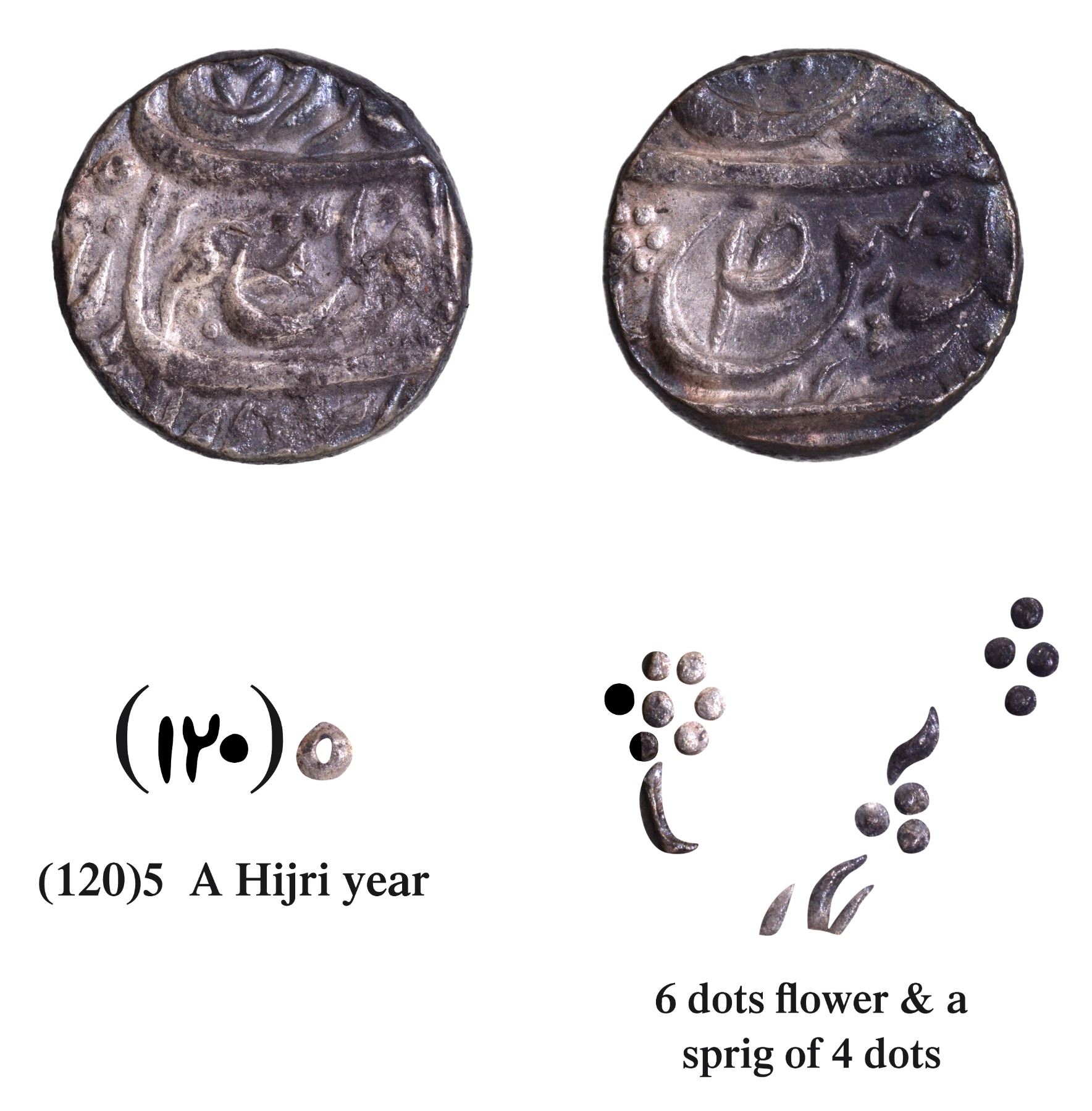 CIS-Patiala, Sahib Singh (AH 1196-1229 /1781-1813 AD), Sahrind Mint (off flan), Silver Rupee, AH (120)5, A coin with an early date of issue, 'Qadir-e-Bechun' Couplet, In the name of Ahmad Shah Durrani, Obv: Persian legend "hukm shud az qadir-e-bechun ba Ahmad Badshah, sikka-e-zan bar seem-o-zar az auj mahi ta bamah" with Hijri year (120)5, Rev: a symbol of "swad" in Persian letter 'seen' of julus and 6 dots flower symbol and a sprig of 4 dots, "zarb Sahrind" off flan at the bottom, 11.2g, 18.98mm, (Unlisted in KM /Variant of Saran & Dalwinder # PT7ja), about extremely fine, Rare.