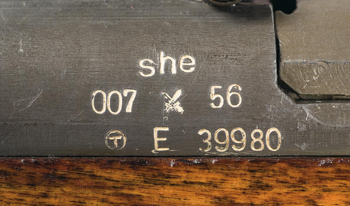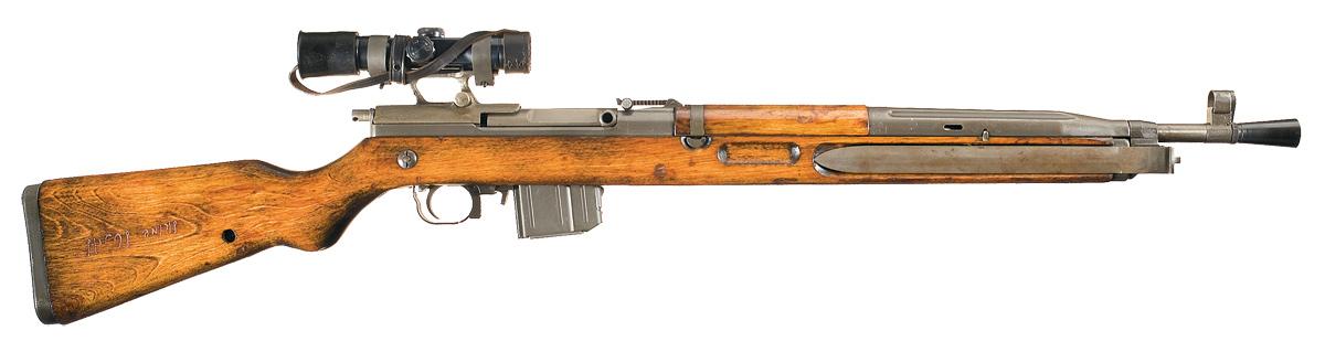 Hooded blade front and tangent rear sights, with "she/ 007 (crossed swords) 56/ E 39980" marked on the left side of the chamber. The upper receiver cover has an integral swept back cast scope mount, with a ZF-4 scope, marked "49" on the left side and "xbk" on top. Smooth hardwood stock, with fluted metal handguard, grasping grooves, sling bases, matching number on the left side of the buttstock, an unclear hand-carved marking on the reverse and a cupped buttplate. Also equipped with a detachable flash hider and an 11 inch flip-out knife bayonet. Rifles in this configuration saw use with the Czech Border Guards during the Colt War Era.