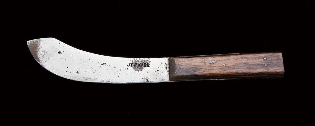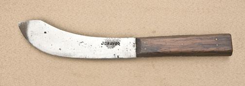 Rare California skinning knife by J. Craver, Stockton, California. Approx. 10-5/8” overall, 6” skinner blade. Blade flat is hot stamped “J. Craver”. Hilt is one-piece select rosewood with five brass pins. The handle is slotted to accommodate two thirds of the blade tang. Some scratches on the back side of the hilt. Blade is in excellent condition with patches of pitting and light sharpening. Circa approx. late 19th Century. Hugh HayesCollection. Est: $250-500
