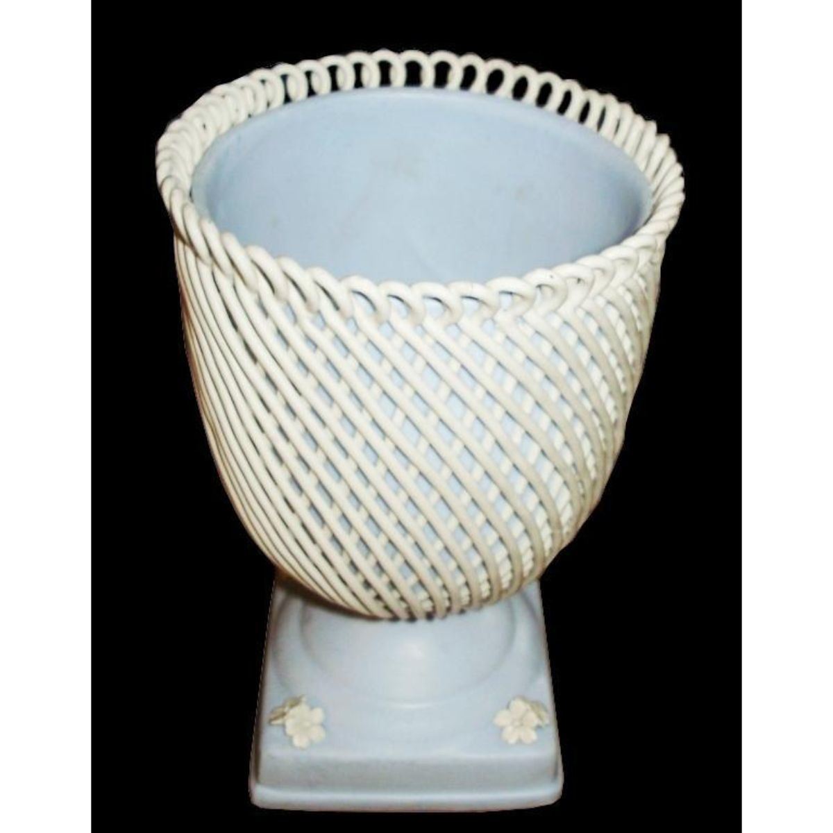 Antique Capodimonte jasperware compote vase with lattice. This is a rare piece. Capodimonte stamp & "Made Italy" on bottom. 6 3/4"X4 1/2 ®. * some loss to the ropes on one side.