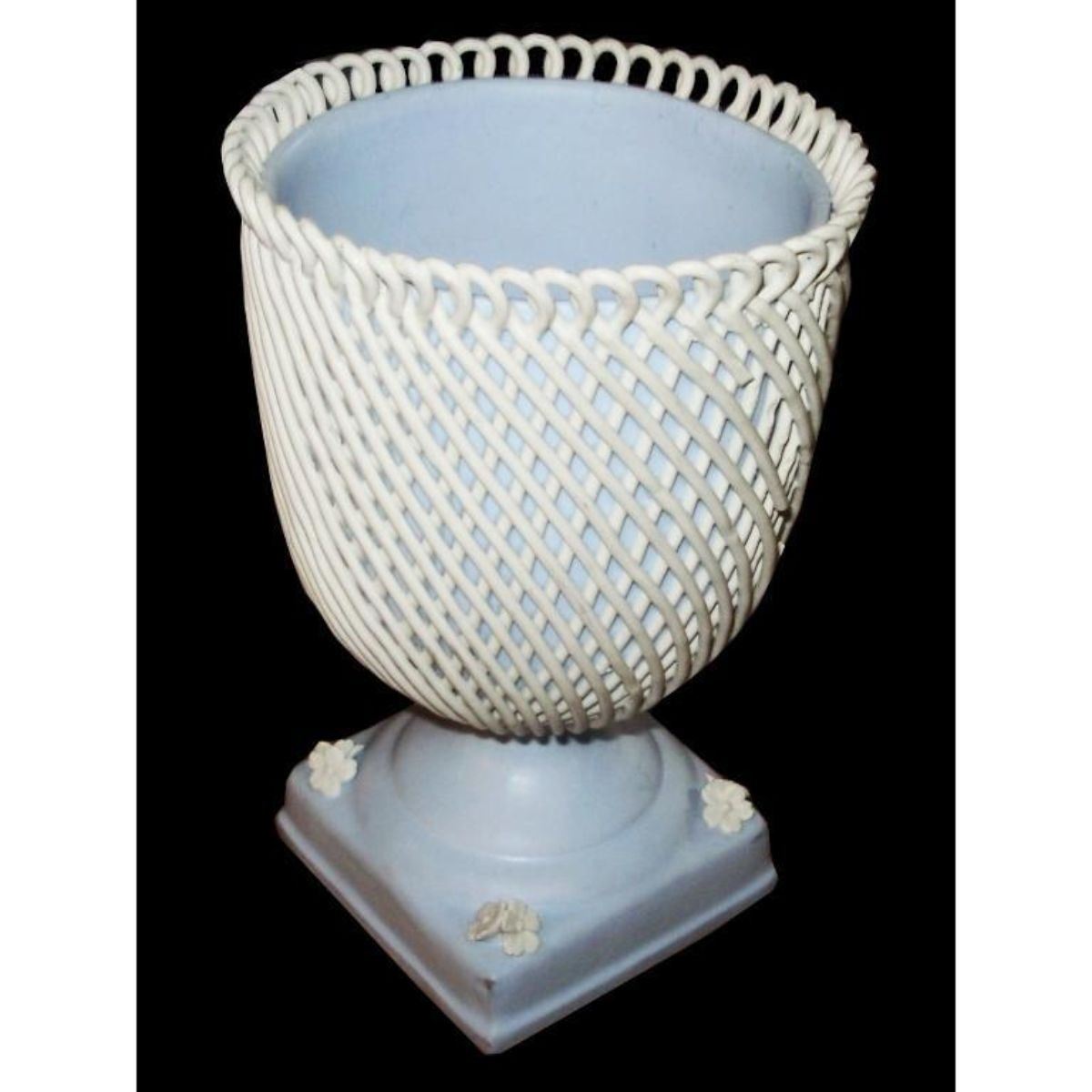 Antique Capodimonte jasperware compote vase with lattice. This is a rare piece. Capodimonte stamp & "Made Italy" on bottom. 6 3/4"X4 1/2 ®. * some loss to the ropes on one side.