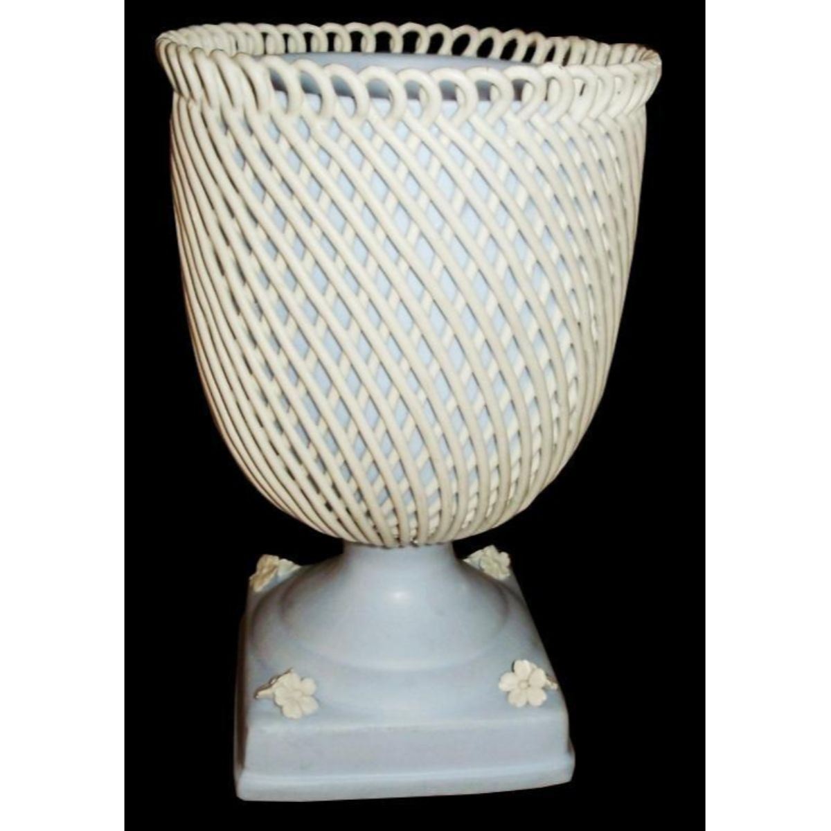 Antique Capodimonte jasperware compote vase with lattice. This is a rare piece. Capodimonte stamp & "Made Italy" on bottom. 6 3/4"X 4 1/2". * some loss to the ropes on one side.