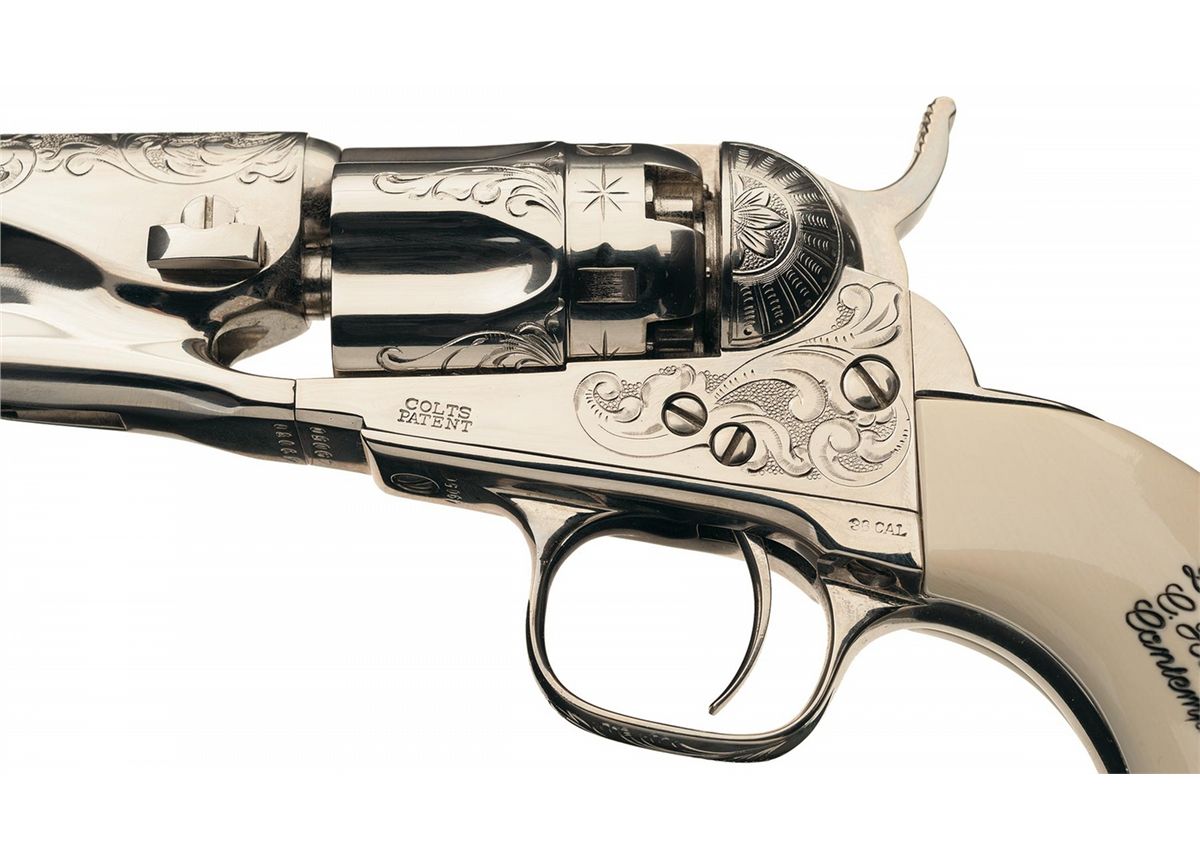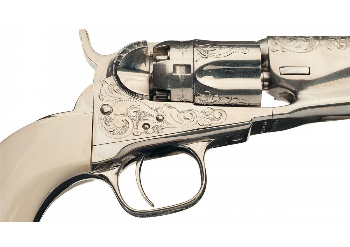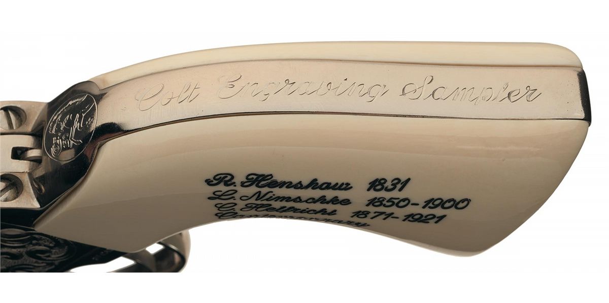 This is 1 of 16 nickel plated 1862 Police engraving samplers manufactured by Colt. There is contemporary floral scroll engraving on the muzzle end of the barrel, Helfricht style on the barrel lug and frame, Nimschke style on the cylinder and Henshaw style on the trigger guard bow and butt. The top of the back strap is engraved with the 150th anniversary Rampant Colt logo. Down the back strap is engraved "Colt Engraving Sampler" in script. Fitted with a smooth one piece ivory grip with "R. Henshaw 1831/L. Nimschke 1850-1900/C. Helfricht 1871-1921/Contemporary" scrimshawed on the left side. With a Colt Black Powder Series hardwood case lined in gold velvet, the original box numbered to the gun, a powder flask, an empty cap tin, a two cavity bullet mold and a screwdriver/nipple wrench.