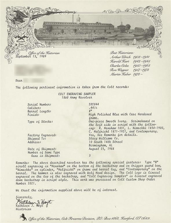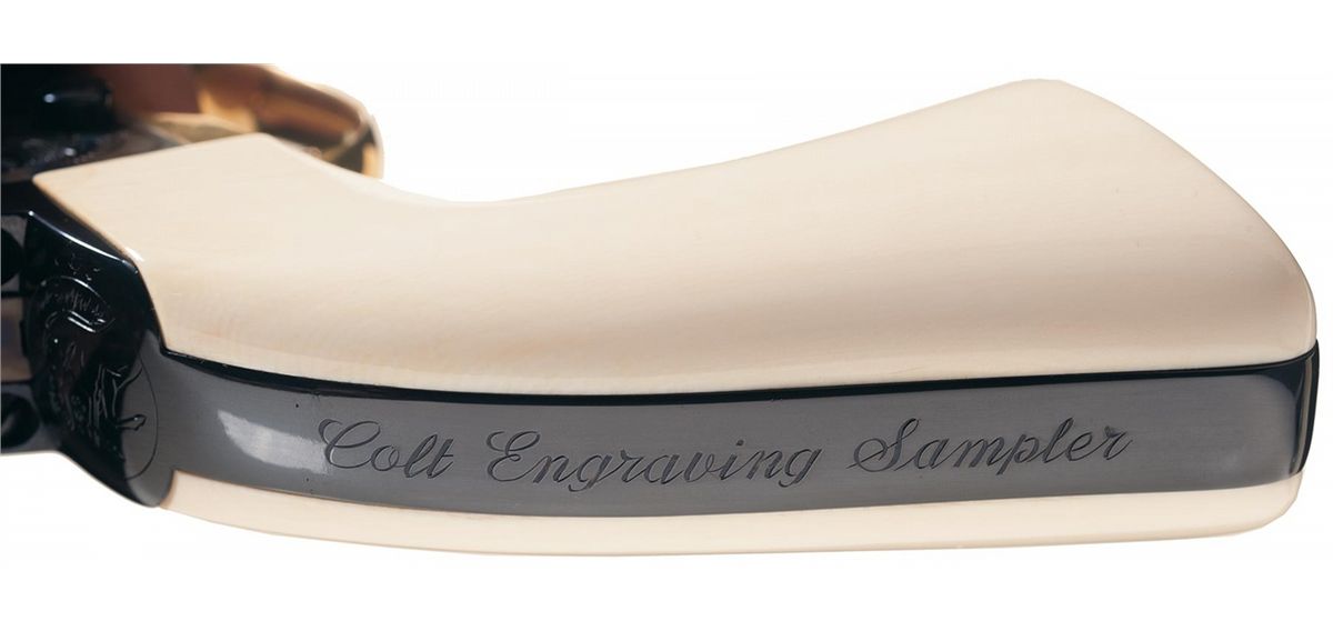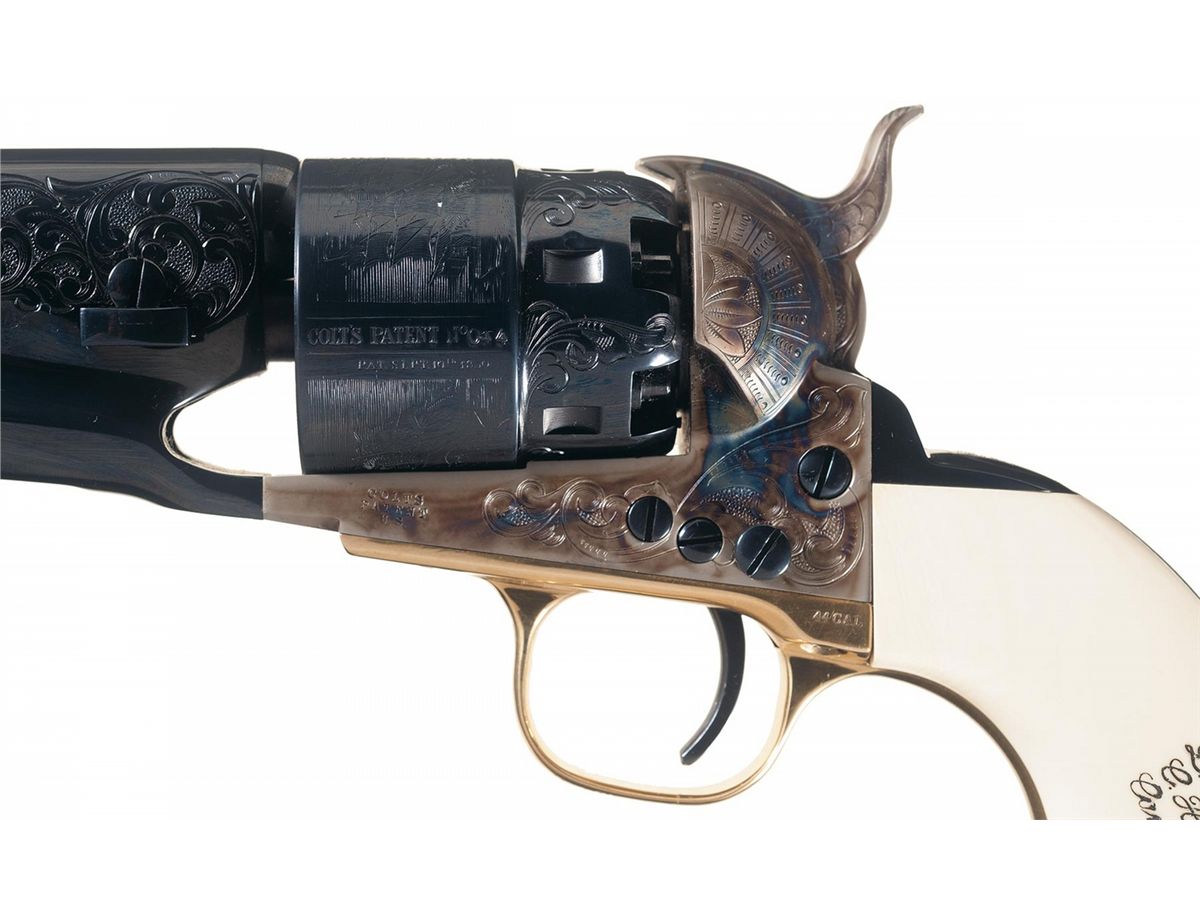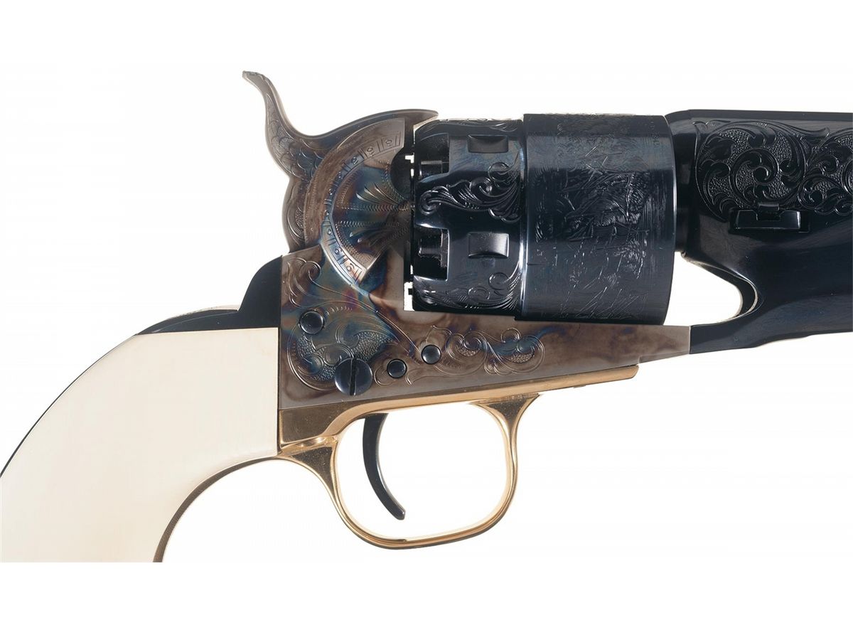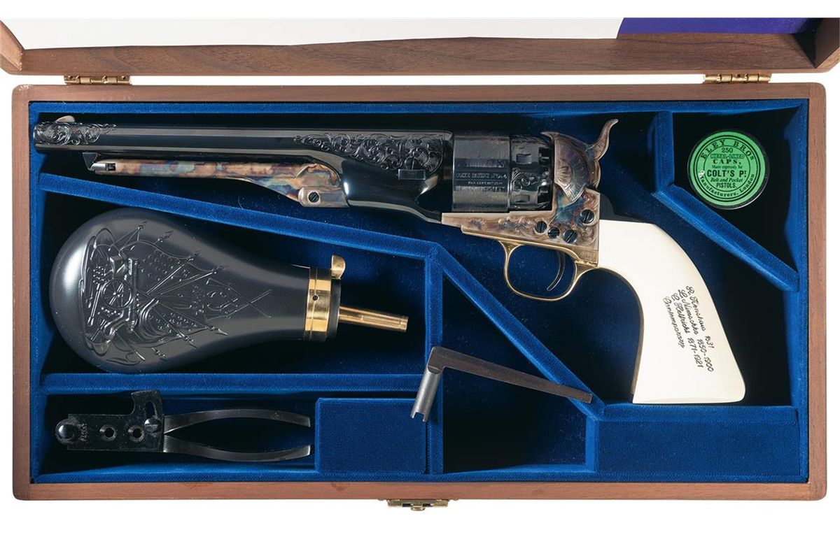 Only 10 of these revolvers were manufactured with beautifully executed floral scroll engraving in several different styles. The styles represented are contemporary on the barrel, Helfricht on the frame and barrel lug, Nimschke on the cylinder and Henshaw on the trigger guard bow and butt. The sides of the hammer are engraved with the wolf's head design. The top of the back strap is engraved with the 150th Anniversary Rampant Colt and down the back strap is engraved "Colt Engraving Sampler" in script. Fitted with a smooth one piece ivory grip with "R. Henshaw 1831/L. Nimschke 1850-1900/C. Helfricht 1871-1921/Contemporary" scrimshawed on the left side. The factory letter confirms configuration, that it was processed on Custom Shop order #3321 and that it was shipped to Stacy Williams Co. on August 25th, 1988. With a Colt walnut case lined in royal blue velvet, powder flask, empty cap tin, screwdriver/nipple wrench, two cavity bullet mold and the original box numbered to the gun.
