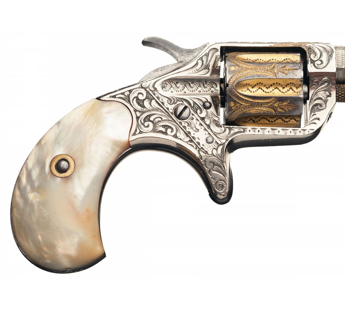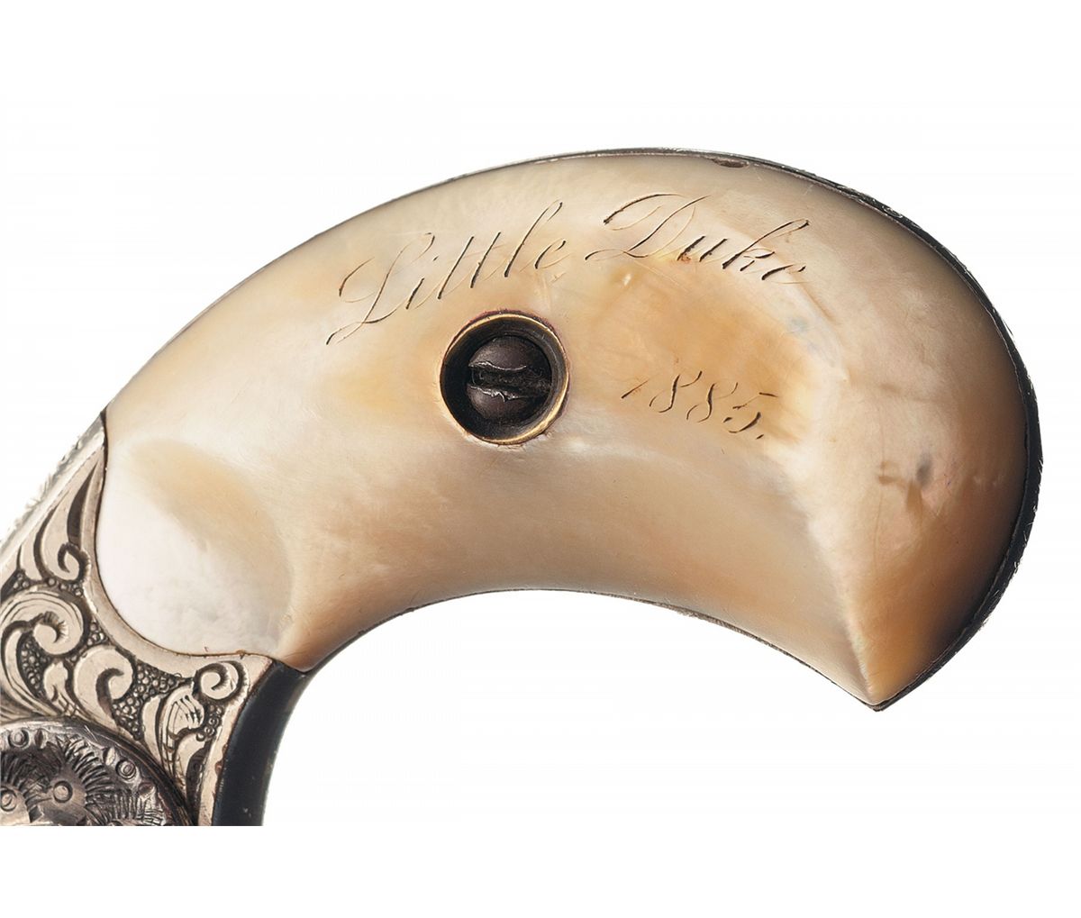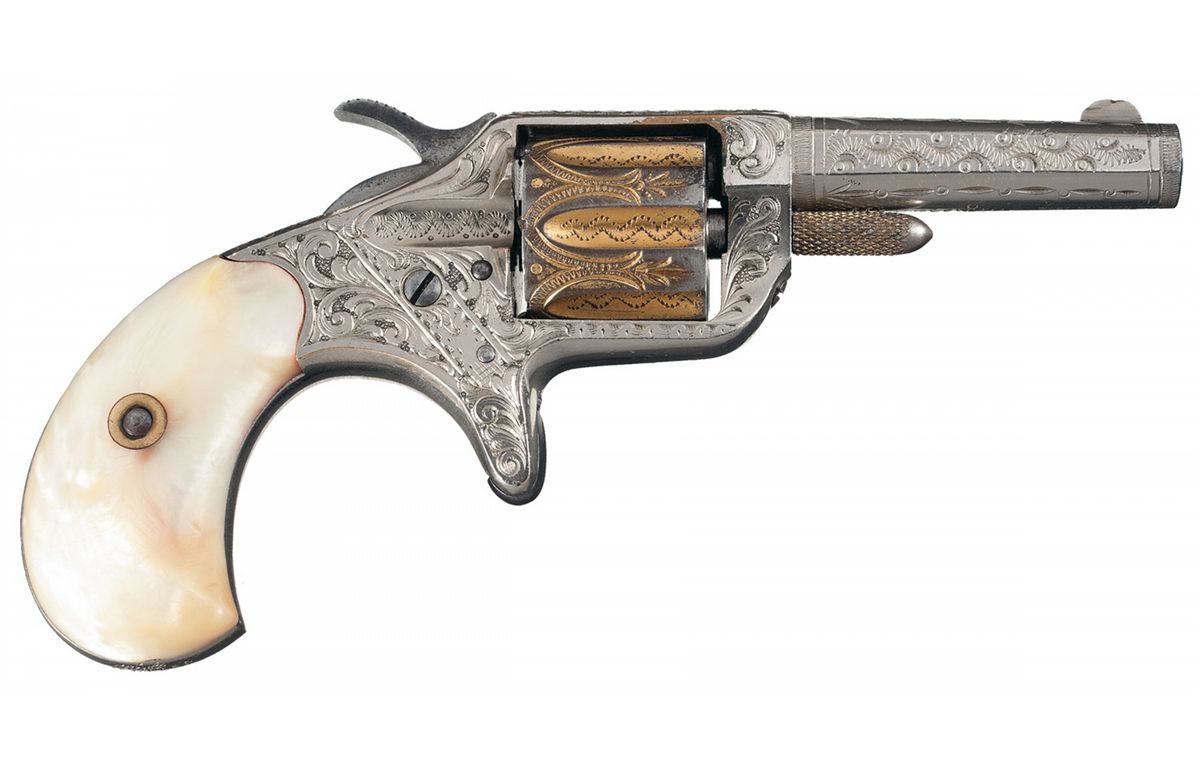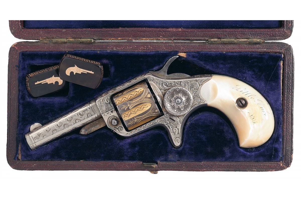 Manufactured in 1876, this revolver features factory scroll engraving on the sides of the frame, a geometric design on the top of the barrel, zigzag and dot design on the sides of the barrel and side plate, a feather design on the top strap, floral design on top of the back strap and decorative zigzag line designs on the cylinder. The top of the barrel is marked with the two line address, the bottom of the barrel is marked with the patent date and the serial number is marked on the butt with the partial serial number "112" on the underside of the barrel. The left frame side is marked "22 CAL", which is partial covered by the engraving. The revolver is nickel plated with a gold washed cylinder and cylinder pin, and is fitted with smooth pearl grips which are scrimshawed "Little Duke/1885" on the left panel. Complete with a leatherette case with silver initial plaque on the lid inscribed "ADW", satin lining on the inside of the lid and purple velvet in the case. In the case is two rectangle shaped tortise shell cuff links with a gold decorative bordering around the sides and a gold image of a New Line revolver on the top.