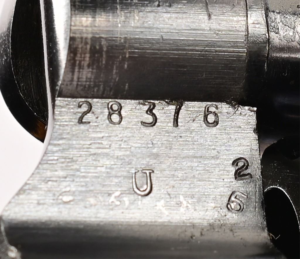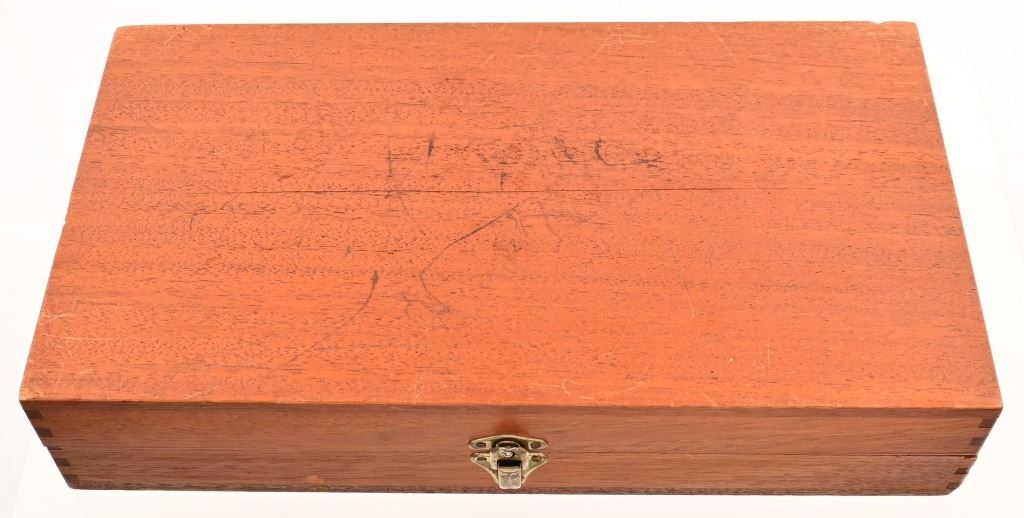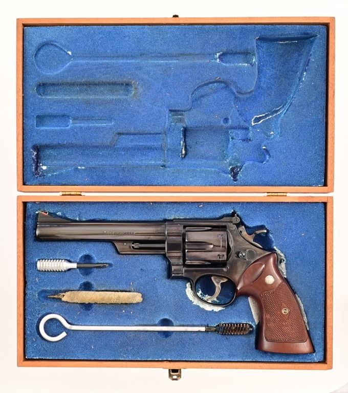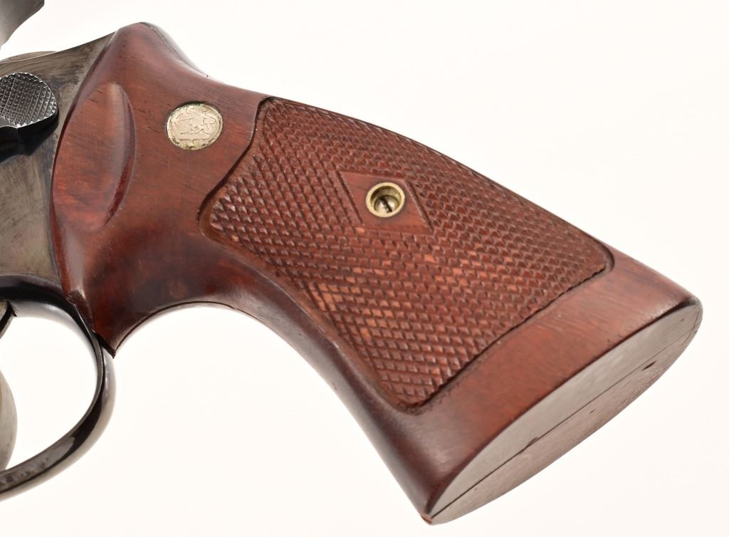 Rare 6.5" pinned barrel, 3 screw frame, blue finish with diamond checkered walnut grips. Serial S230906 (1962-1963), Excellent condition, with presentation wood case that is not original to the gun, and in need of interior work.