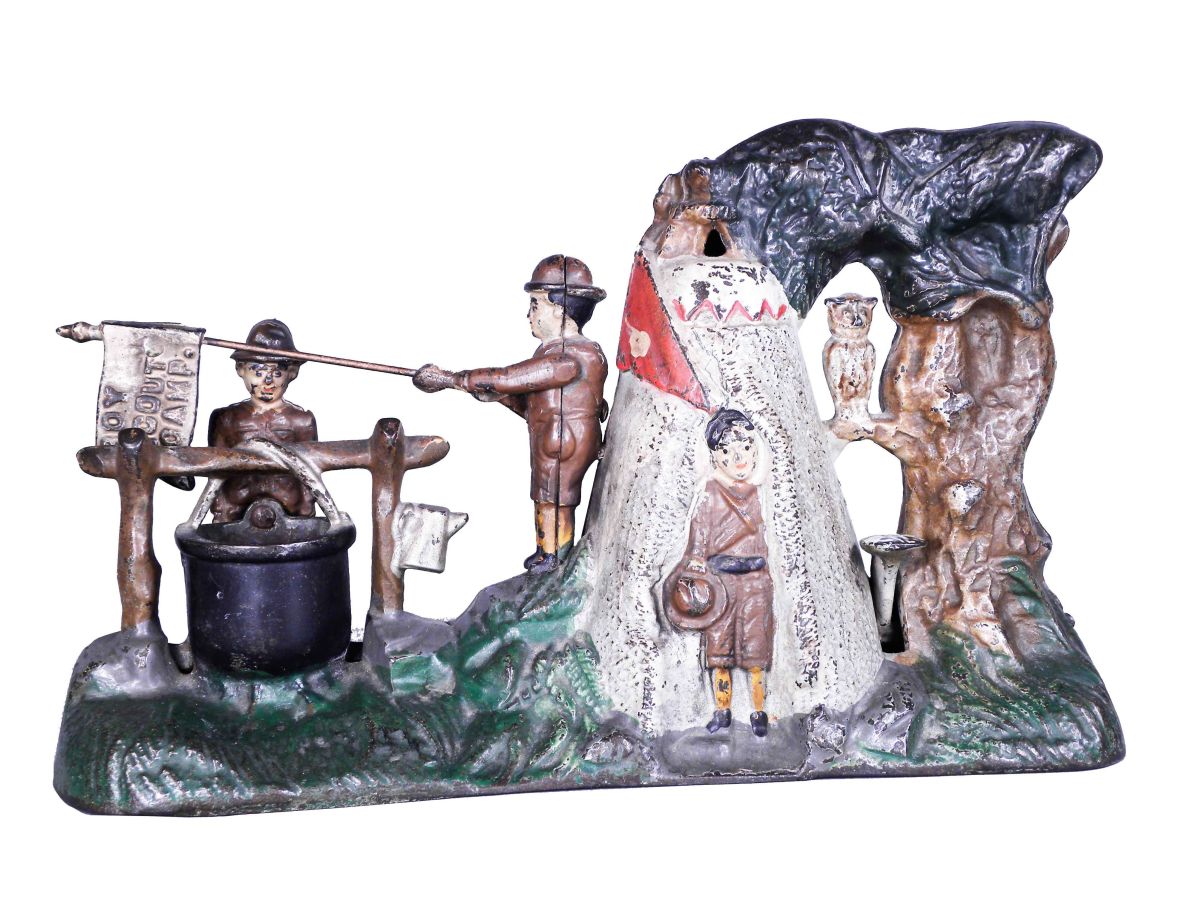 Rare Cast Iron Boy Scout Camp Mechanical Bank. Excellent original condition with 90% of original paint intact. 9 1/2 inches long.