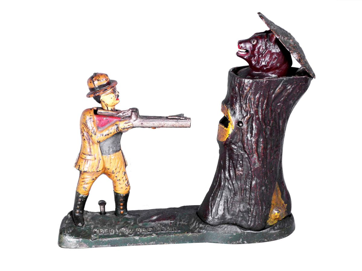 Very Rare Cast Iron Teddy and the Bear Mechanical Bank. Comes with Trade Card. Excellent original condition with 95% of original paint intact. 10 inches long.