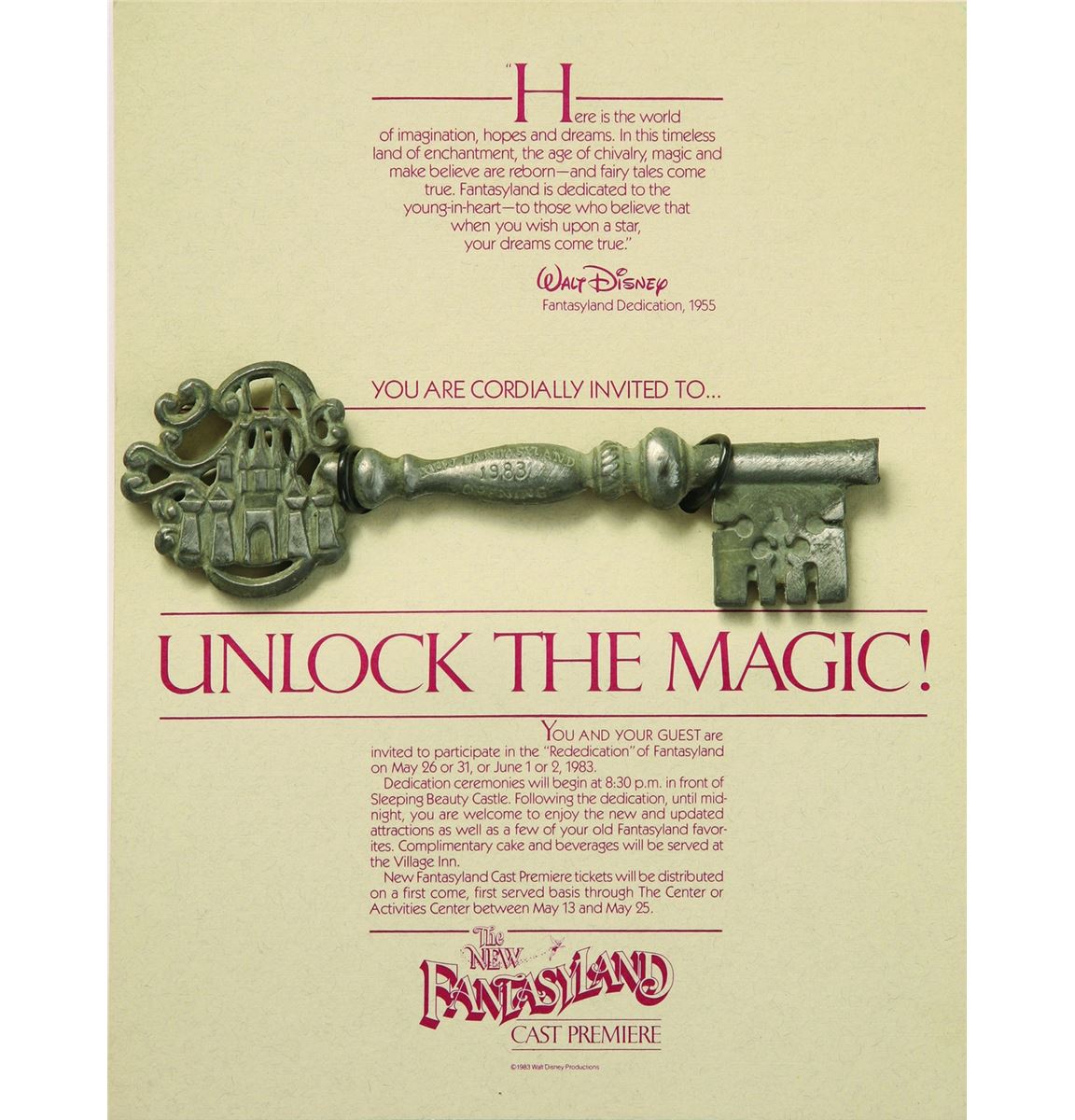 (Disneyland, 1983) Rare and impressive cast invitation to the opening of the “New Fantasyland” in 1983. The 7.25”x9.5” invitation features a cast metal key inscribed “New Fantasyland--1983--Opening”. In very good condition with slight wear on edges.